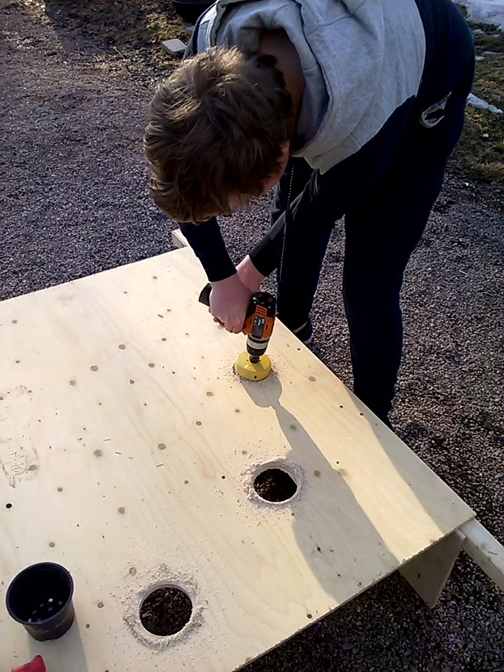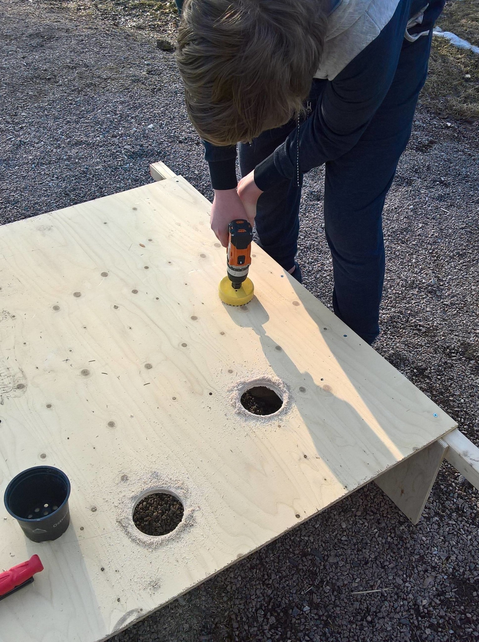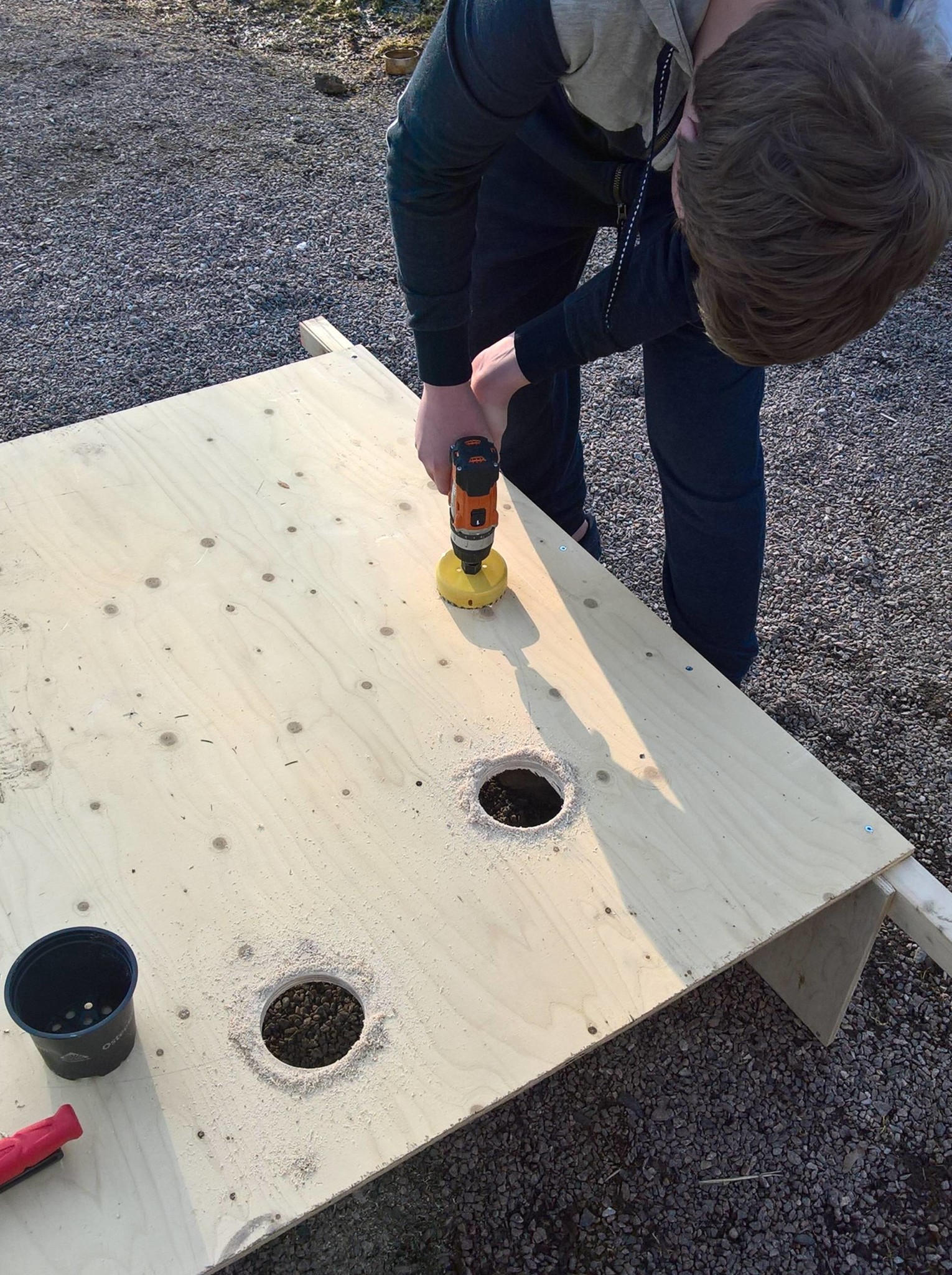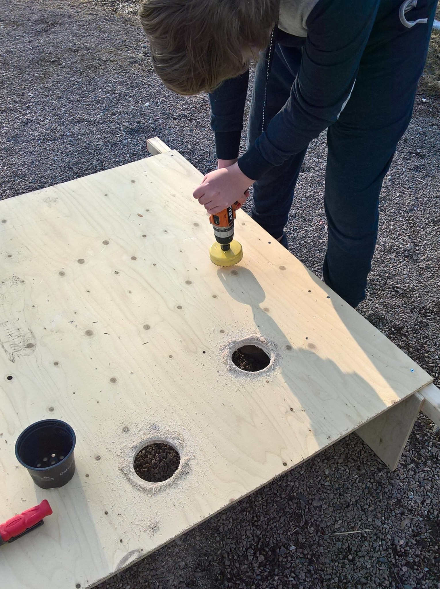 Han vill ha en odlingslåda för småkrukor med smultron och jordgubbar i.