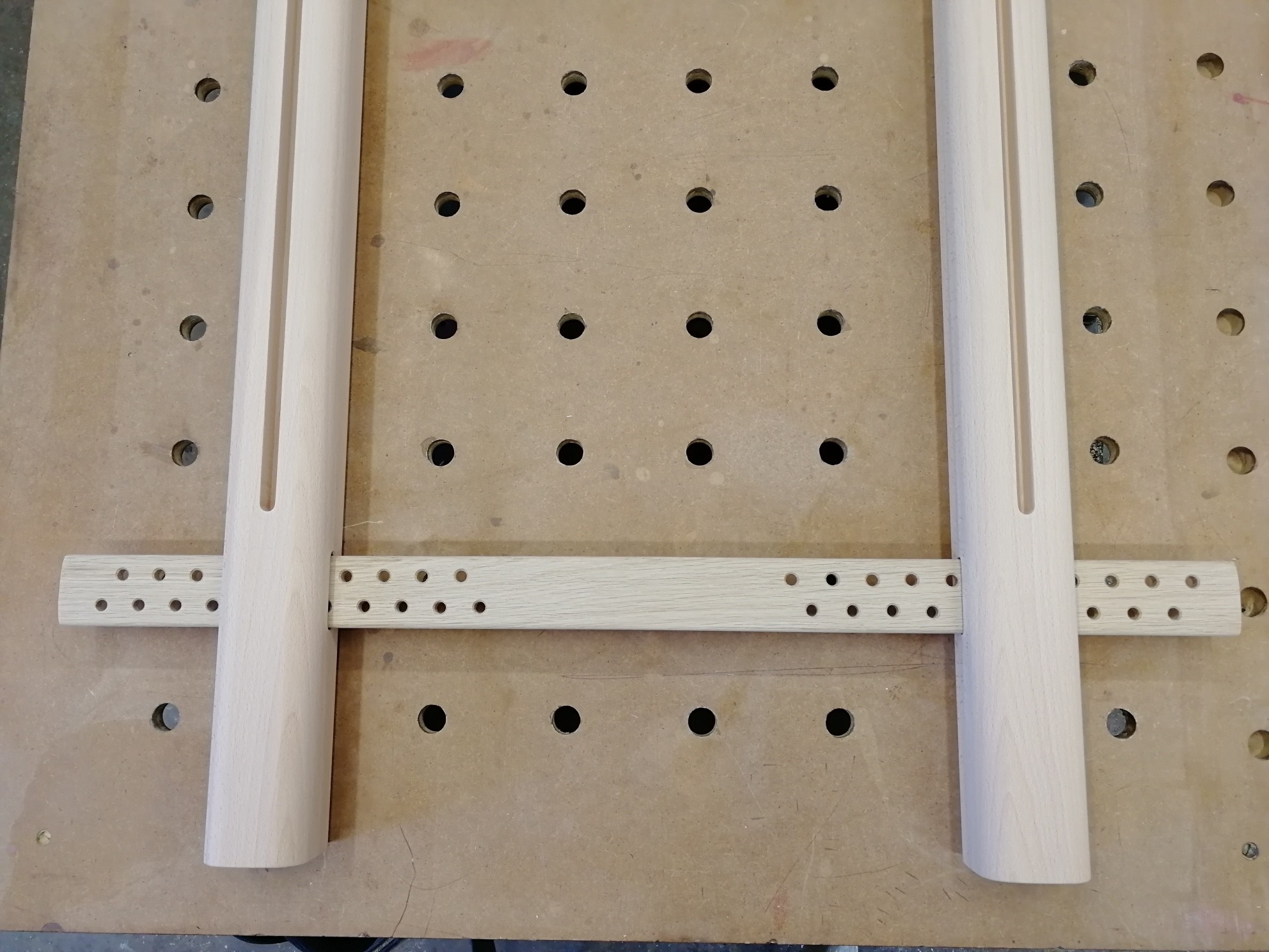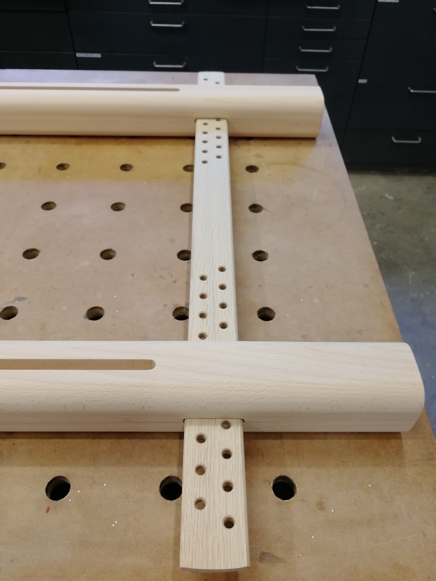 Allting är obehandlat, vilket var viktigt. Kvistfri bok och ek av hög kvalitet. Den stora radien på bommarna är medfräst i vertikalfräsen (med matarverk såklart), spåret är fräst med handöverfräs med dubbla anhåll och det genomgående hålet är kört i vår nya långhålsborr.