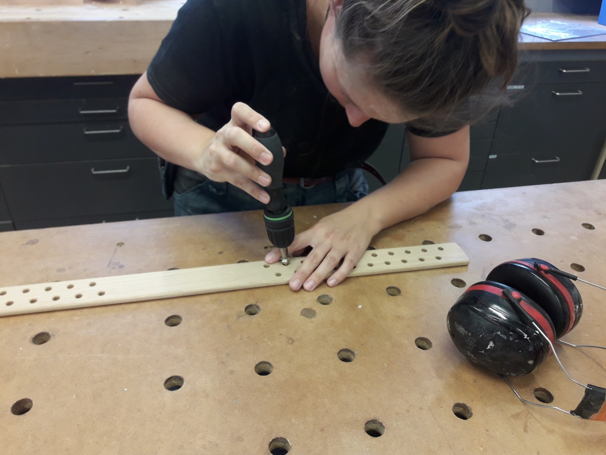 Borrning och försänkning av hålen i eken var en viss utmaning. Att få till bra hålkanter i ek vid försänkning kan vara lite kämpigt. Efter borrning och försänkning med 90-graders försänkare (som ju ger 45-graders vinkel på hålet) så gör Alexandra en "avgradning" där hålet möte fasen med en 60-gradig försänkare för hand. Med den treskäriga försänkaren räckte det med en snabb snurr för att få en perfekt kant. Sen gjordes motsvarande manöver med en 120-graders försänkare, vilket tog hand om kanten mellan fas och flatsidan på spjälan. Det gick snabbare än vad man kan tro och höjde arbetet en nivå.