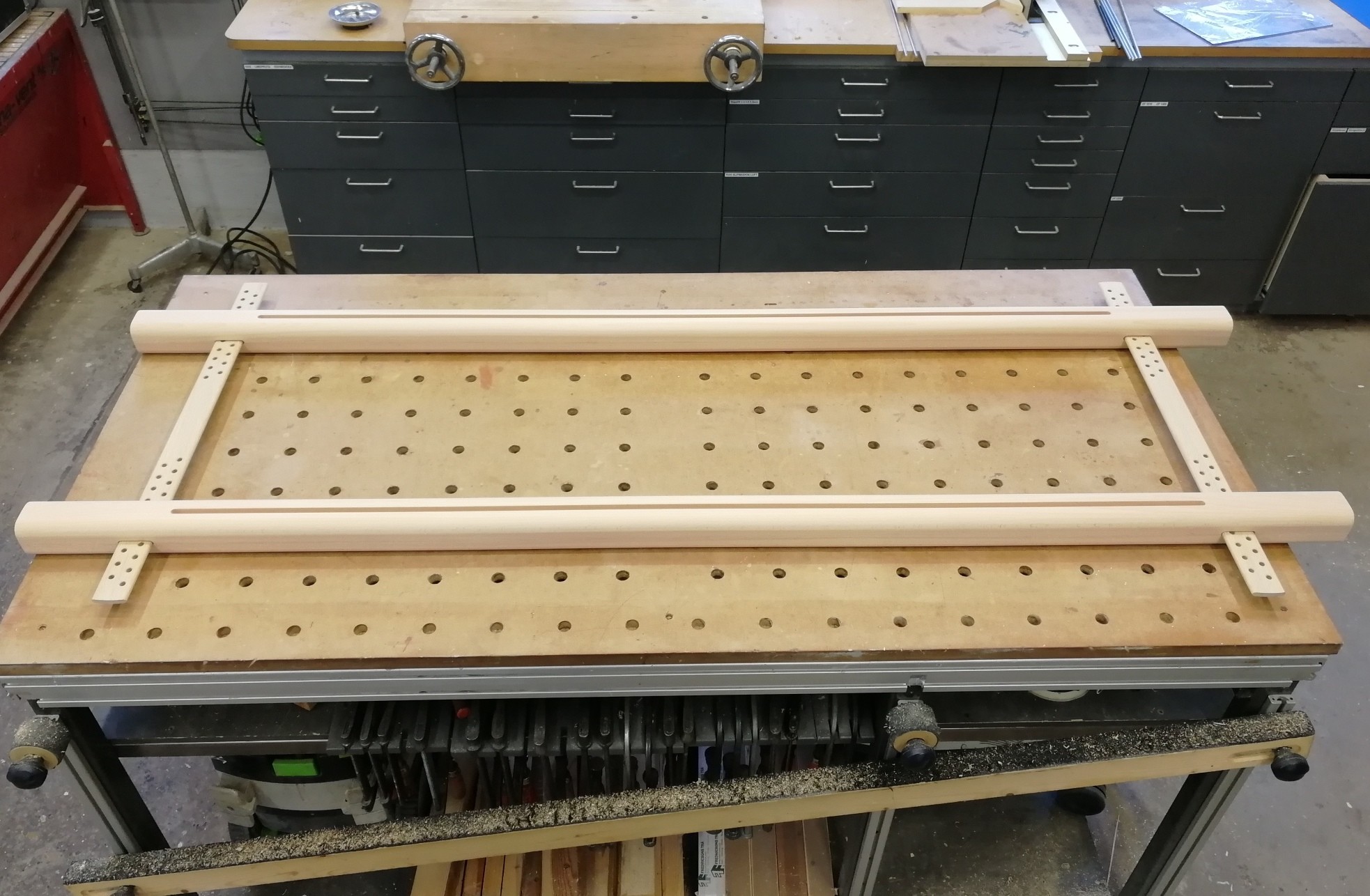 Idag har Alexandra färdigställt en sorts ram som används för at brodera textiler för kyrkor. Vi vet tyvärr inte så mycket mer om den än så. Vi är förvisso vana att arbeta i kyrkor, men inte med textilerna. På något sätt spänner man upp ett tyg för brodering mellan bommarna i bok med hjälp av spjälorna i ek.