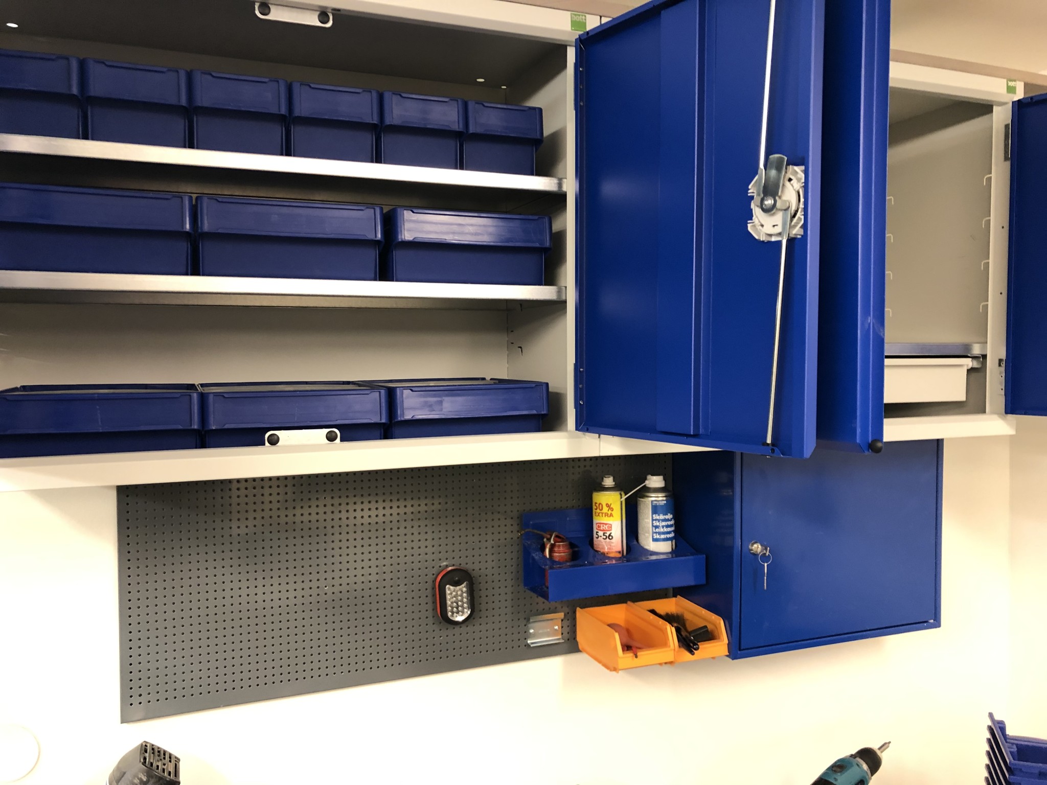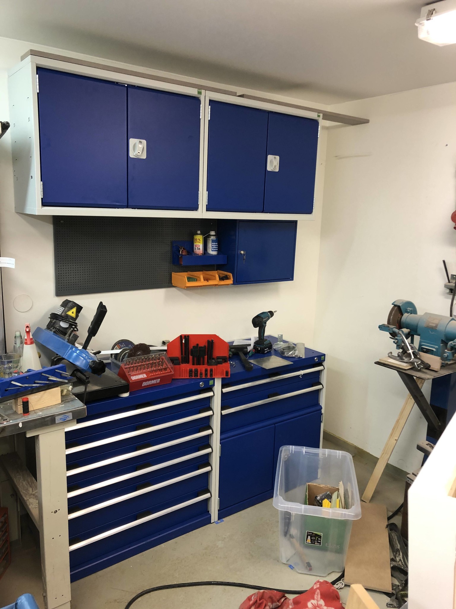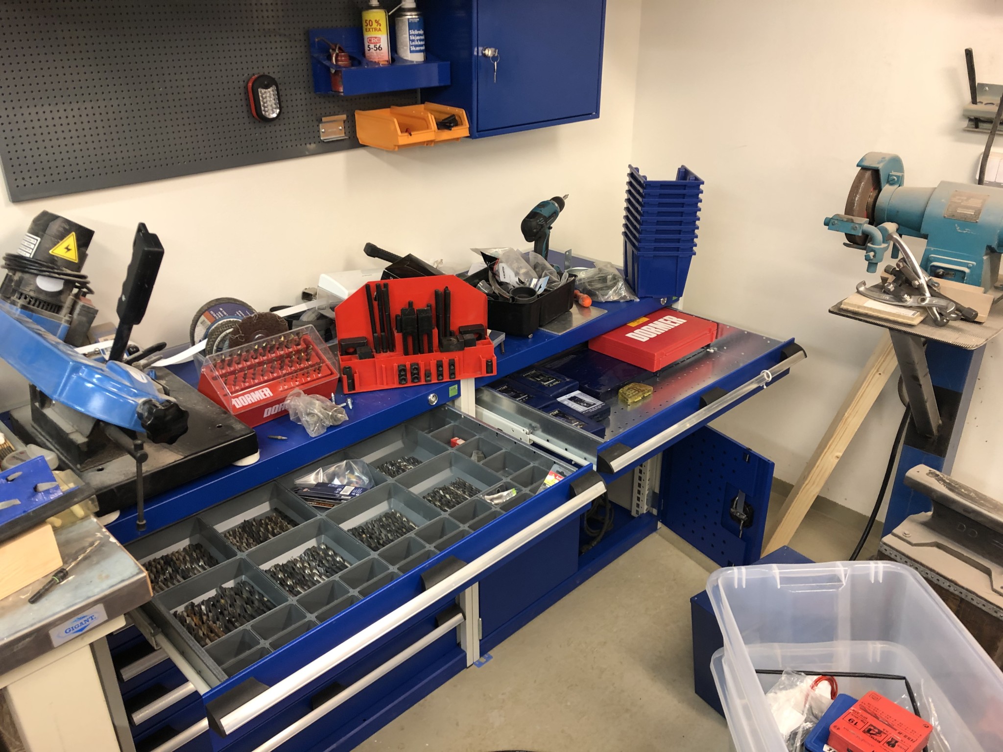 Passar på att omorganisera i verkstan i samband med att nya svarven ska in. Gjorde en Frustrator / OlaC och tömde ut allt som har med metallbearbetning på golvet och har börjat strukturera upp allt. I lilla rummet där gamla svarven stod kommer jag ha backställ för förbrukningsmaterial och annat jox så jag enbart har verktyg i själva verkstan. Så här ser det ut när jag fått skåpen på plats och börjat med sorteringen.