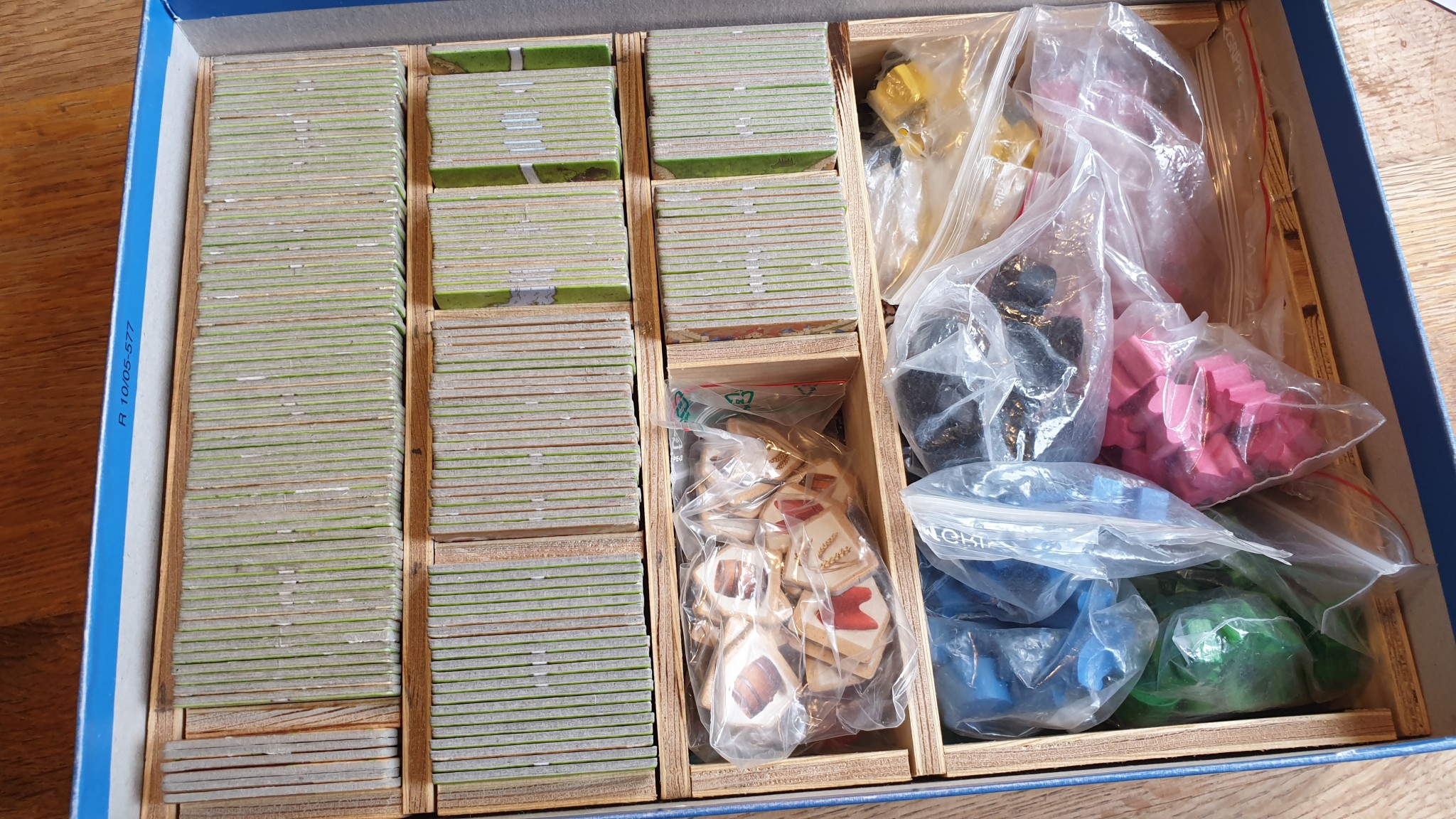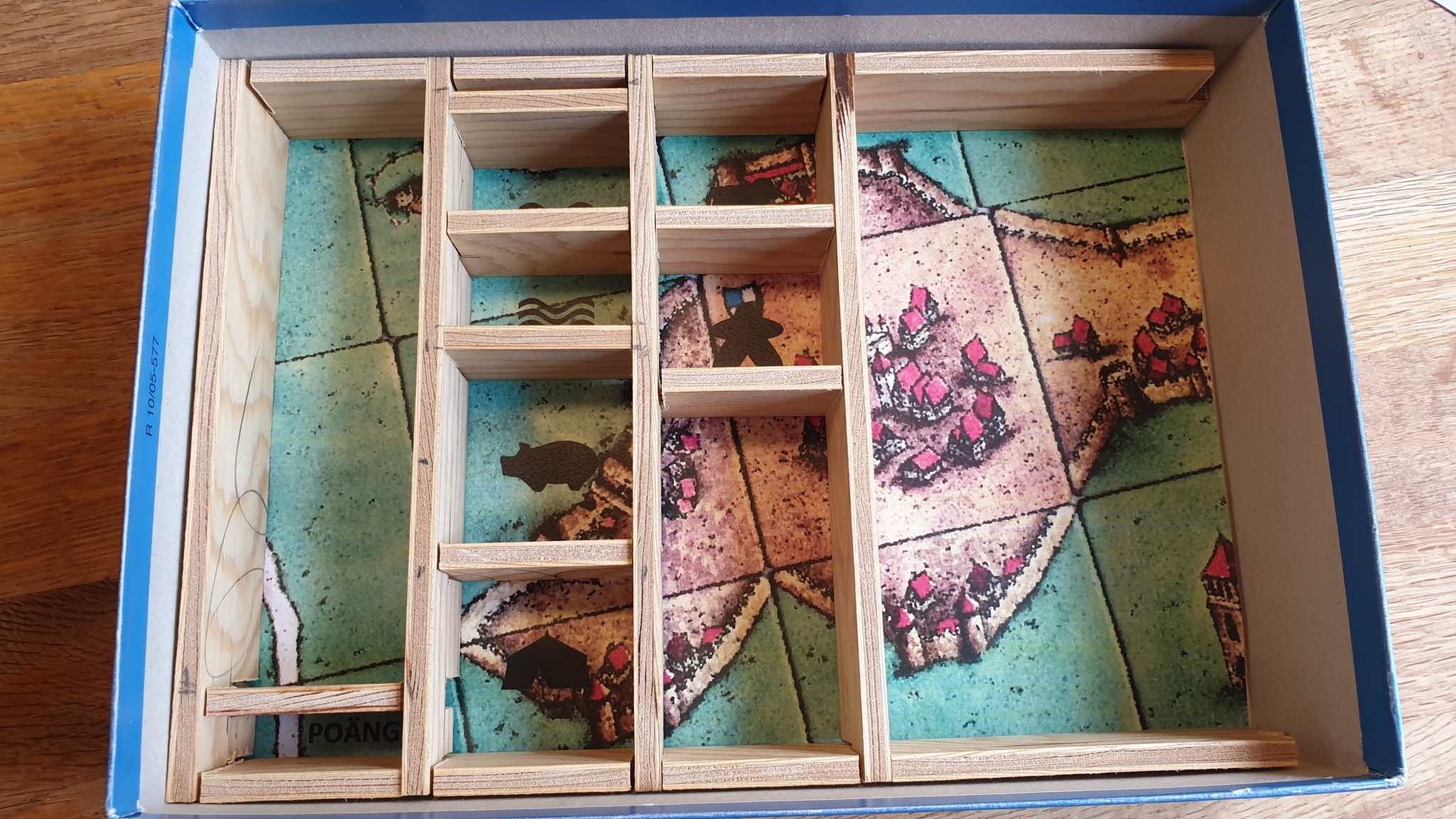 I takt med att jag köpt fler expansioner till mitt Carcassonne (brädspel) har det växt ur insatsen i originalkartongen så nu är en ny insats på plats. Det blev ett stort lyft då jag nu kan ha bättre ordning och dessutom får plats med allt i en och samma kartong Trots det ser jag insatsen som en prototyp eftersom jag räknar med att skaffa ytterligare expansioner inom kort. Dessutom fick jag justera storleken på några av facken genom att bredda spåren som avdelarna går i, så det är lite för mycket glapp för att jag ska vara tillräckligt nöjd.