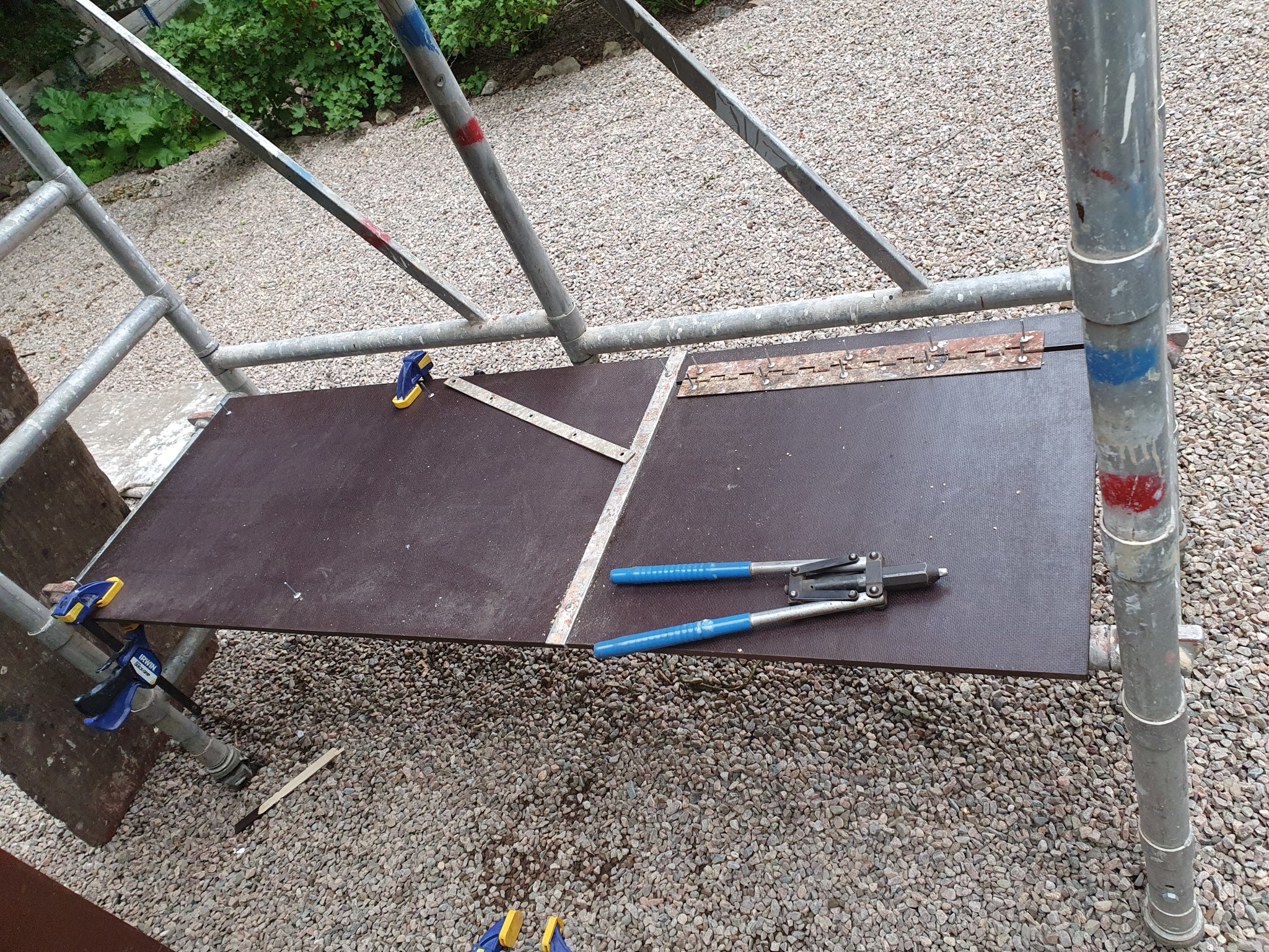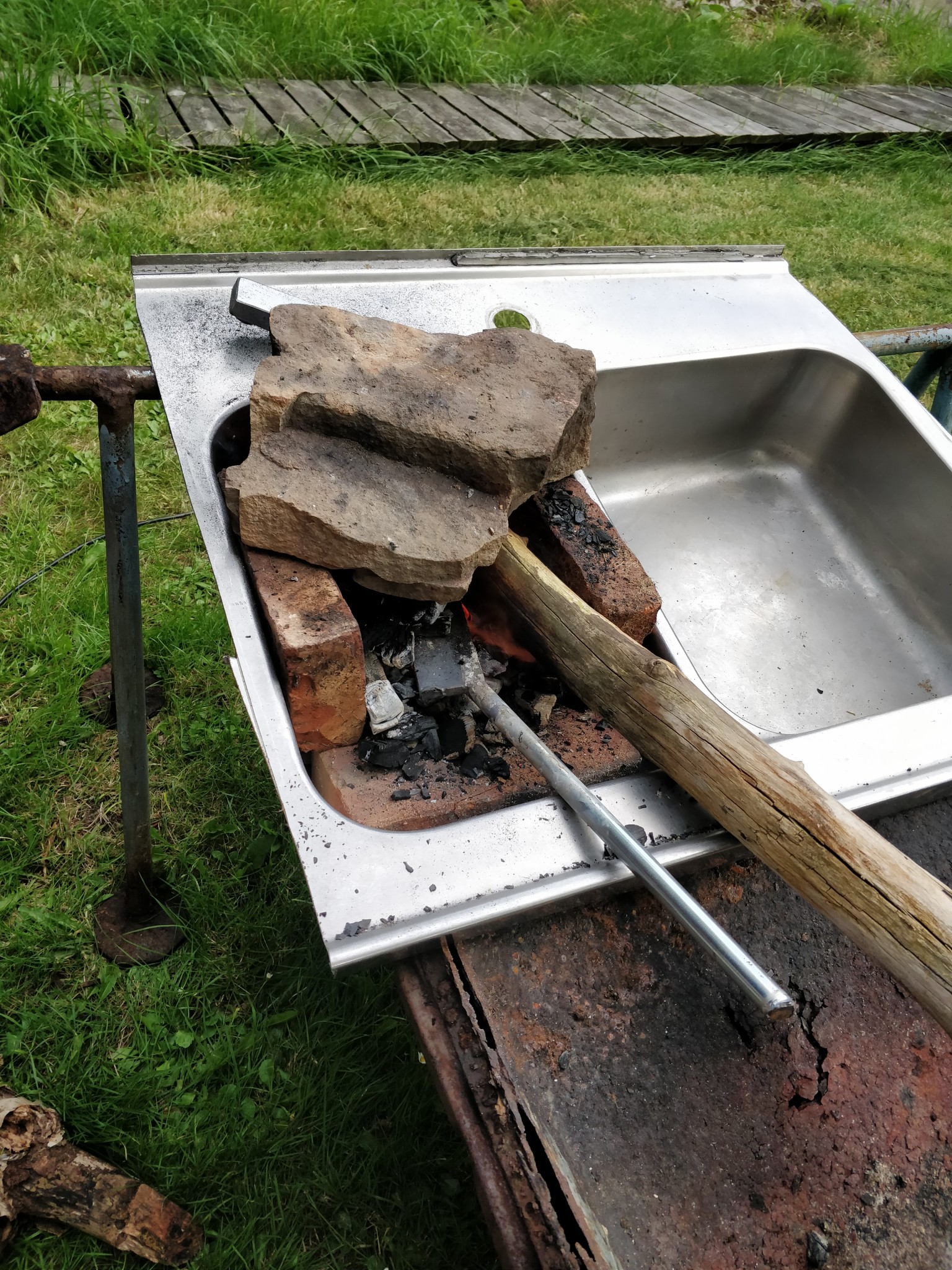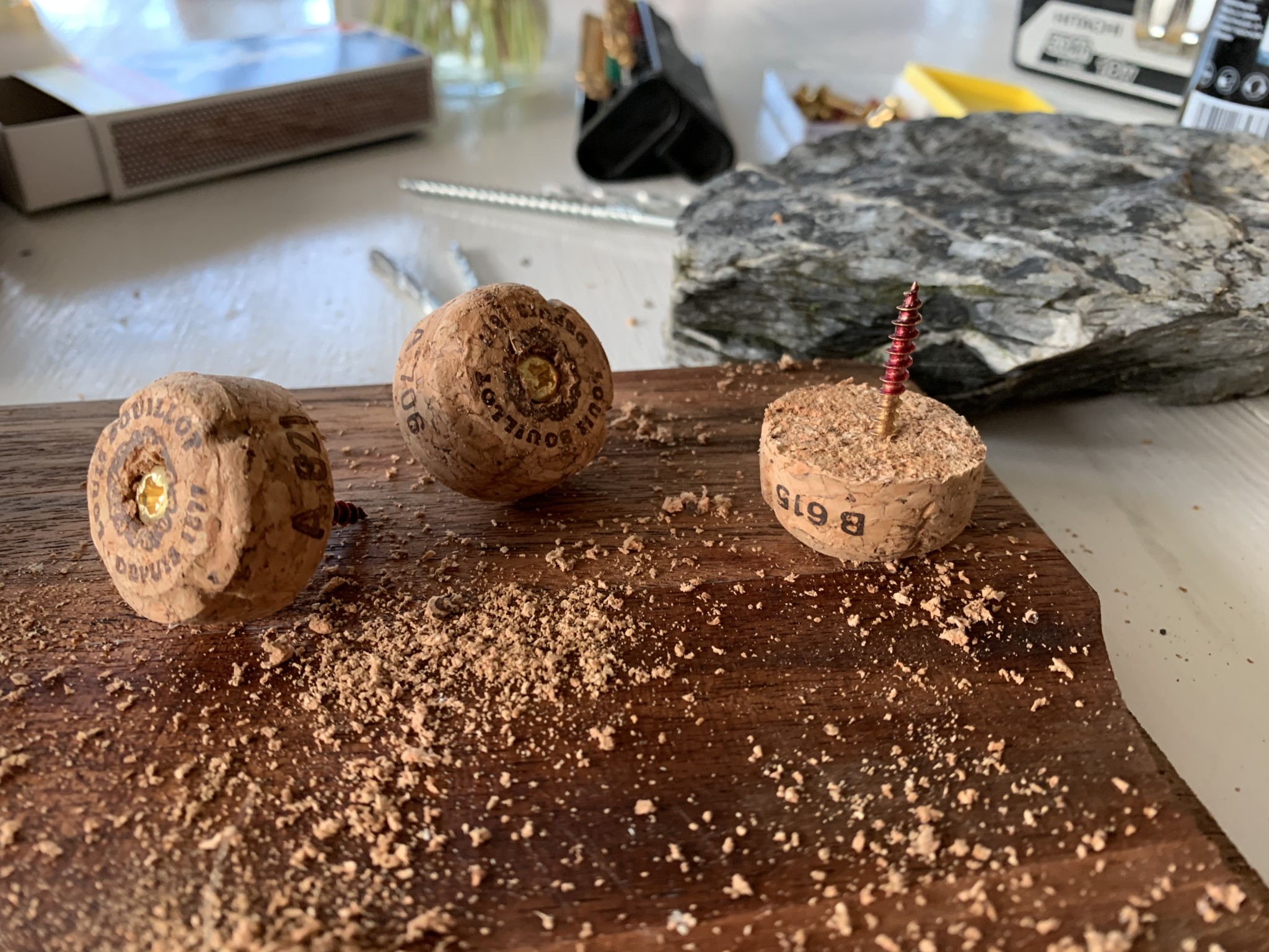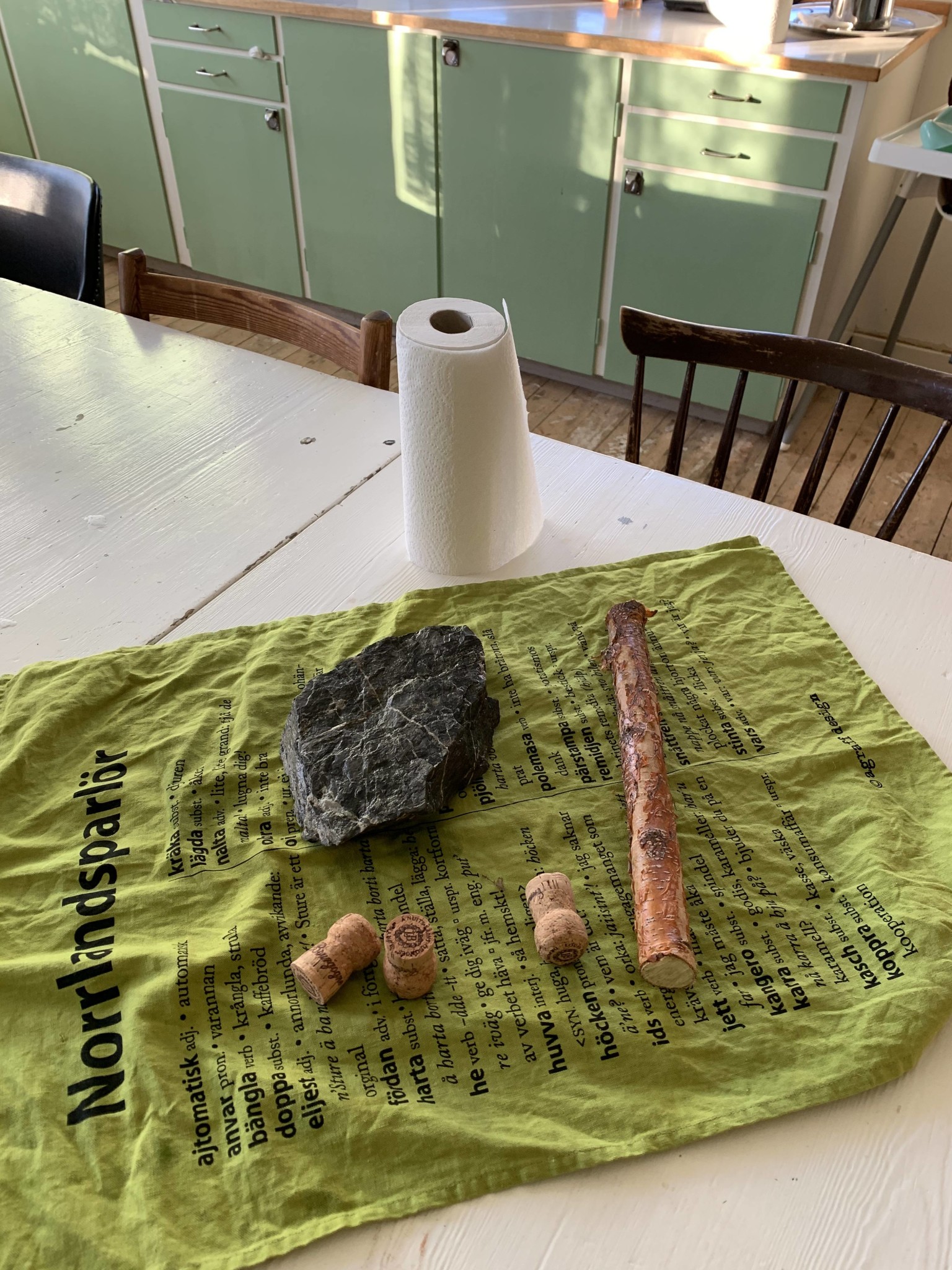 Tog med material in för en pappersrullehållare. En tar vad naturen erbjuder och det är viktigt att välja noggrant. Skiffern bör ha lagrats under tryck i ca 500 000 000 år och ha fiberriktningen vinkelrätt hålen som ska borras. Björken är med fördel färsk och lackas med trälim:vatten 1:3. Champagnekorkarna lagras efter tycke och smak.