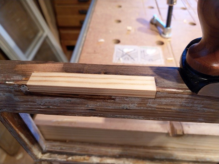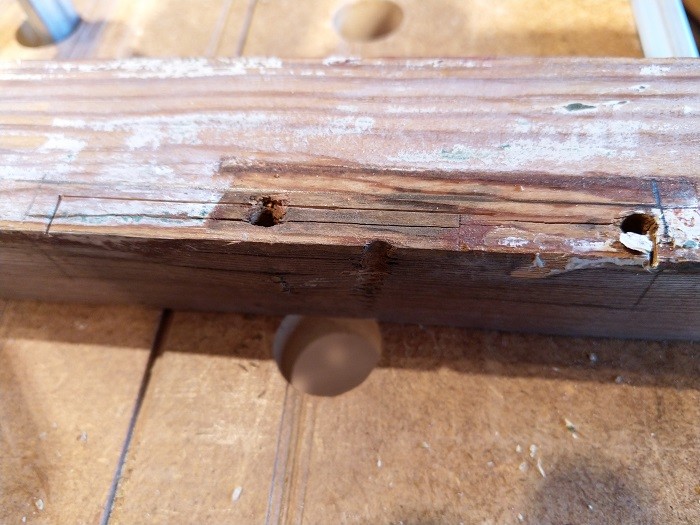Någon har för länge sedan slarvigt skruvat på ett gångjärn och spräckt trät i en av bågarna: