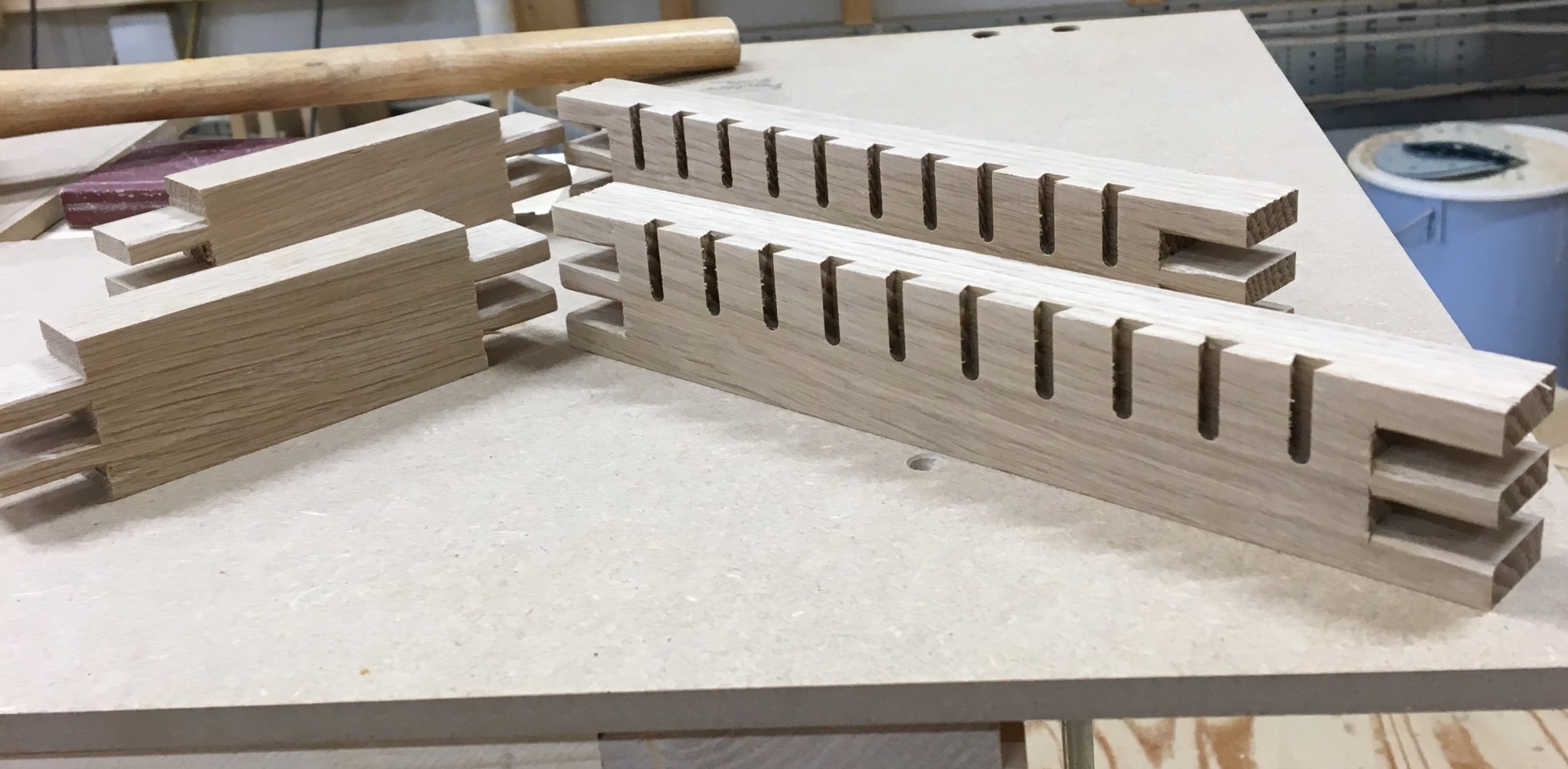 Snickeriet har en fiffig fräs för att sätta ihop ramar utrustad med anhåll och med skalor. Använt den för att göra gradspår innan sammansättningen. Gjorde gallerlameller i 8x30 mm ek.