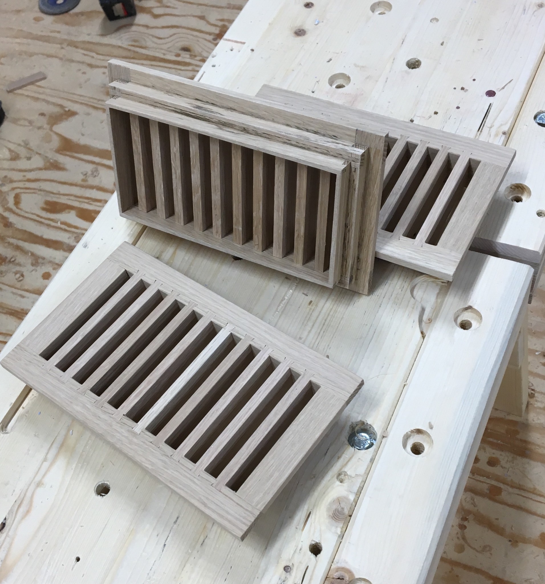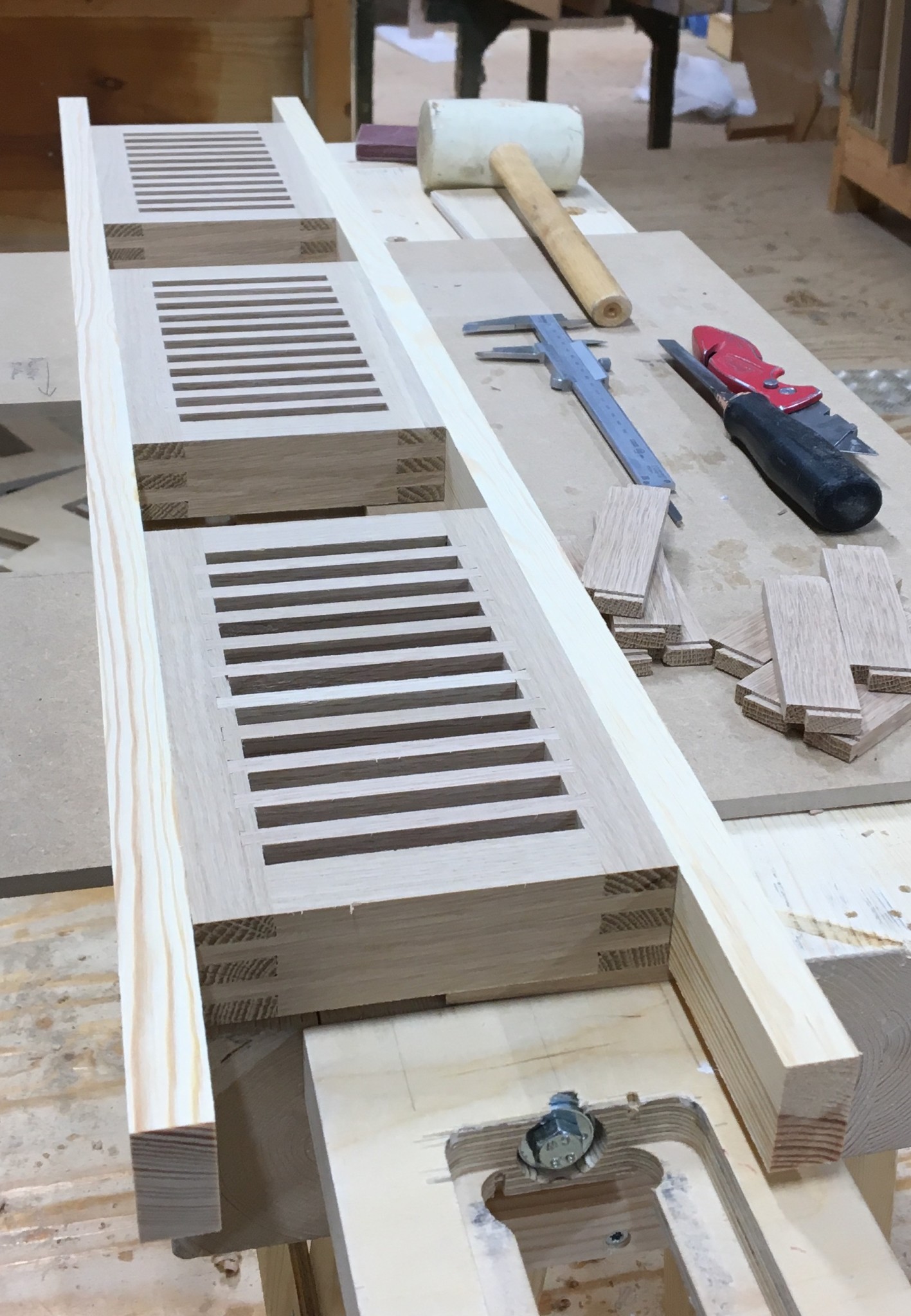 Limmade ramar kan lätt bli lite skeva. Lamellerna var tröga så de har jag bara pressat på plats. Hela gallerna har sedan skruvats fast mellan två lister på ett plant maskinbord. Sedan har gallerna kunnat riktas genom att upprepade gånger körts genom en valsputs.