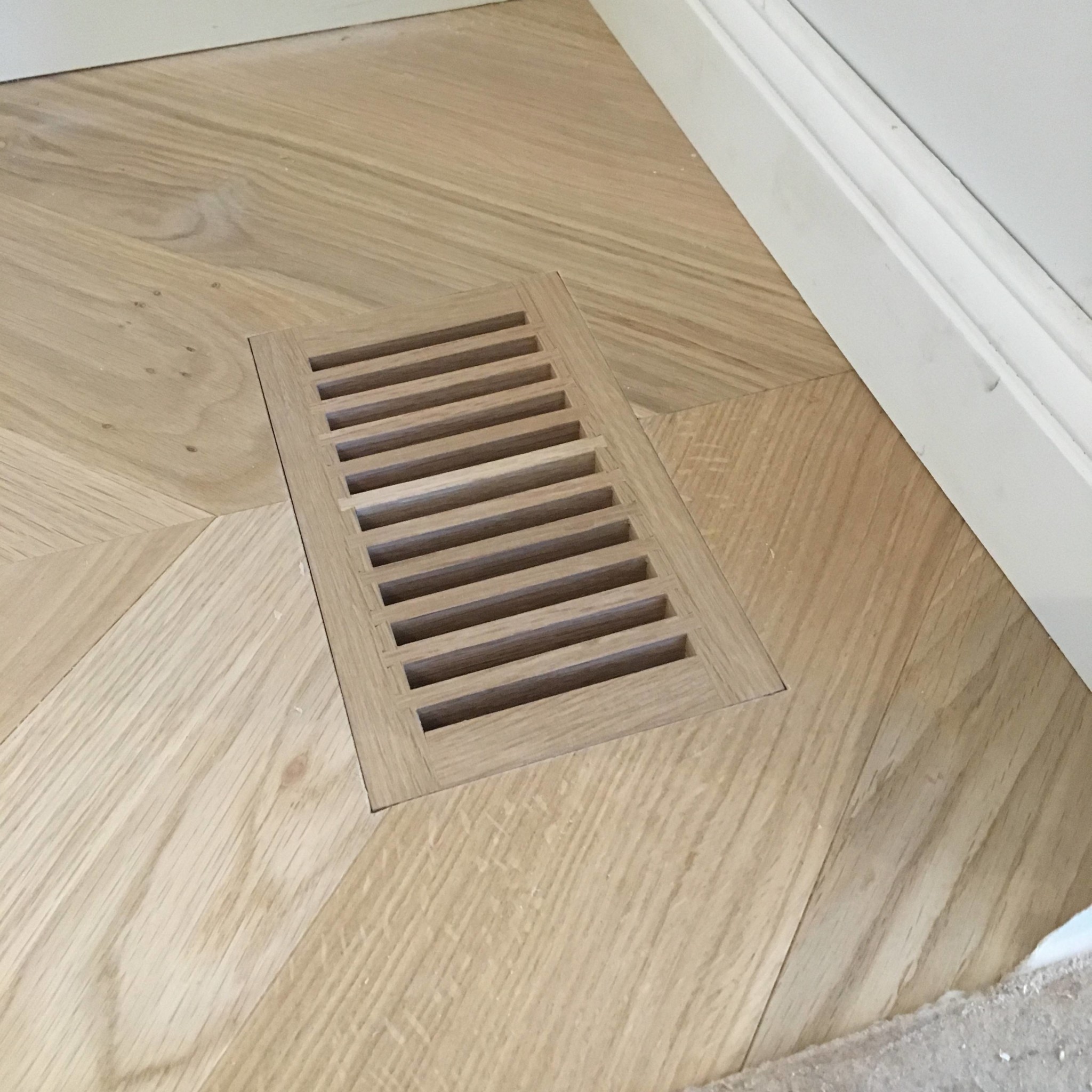 Hittar rektangulära ventrör ca 25mm under golvytan. De som lagt golvet har sågat ut någorlunda nära. Tror att de som projekterat ventilationen nog tänkt sig något standardgaller.