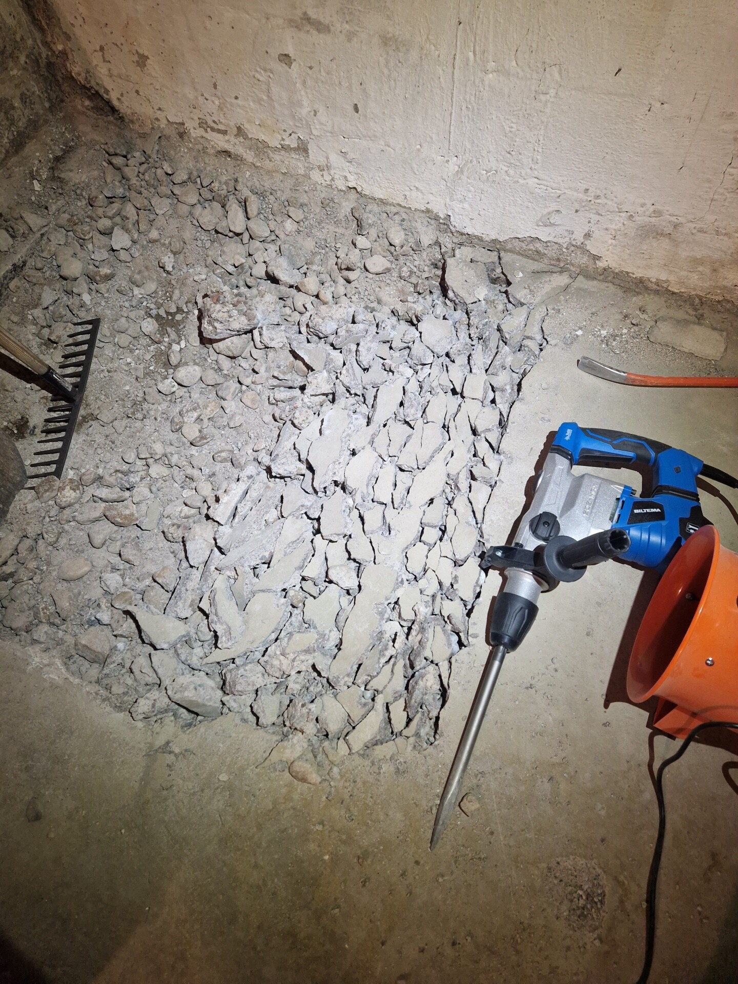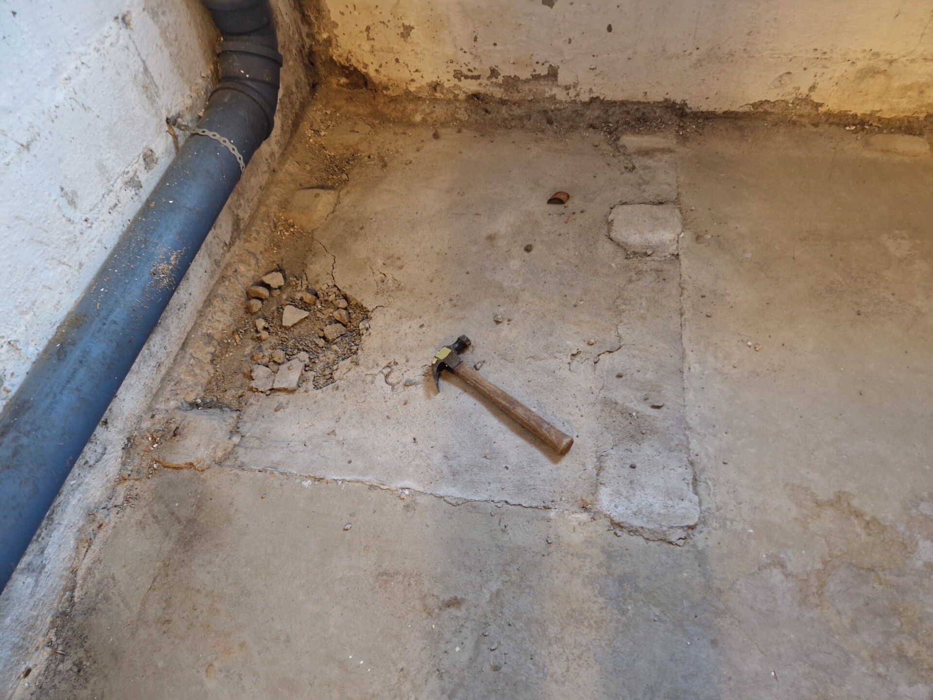 Ena hörnet, det på bild, sviktar när man går på det så jag bestämmer mig för att knacka lite med hammaren. Betongen faller sönder, endast en halv cm tjock, och under är bara grus och andra fyllnadsmassor.
