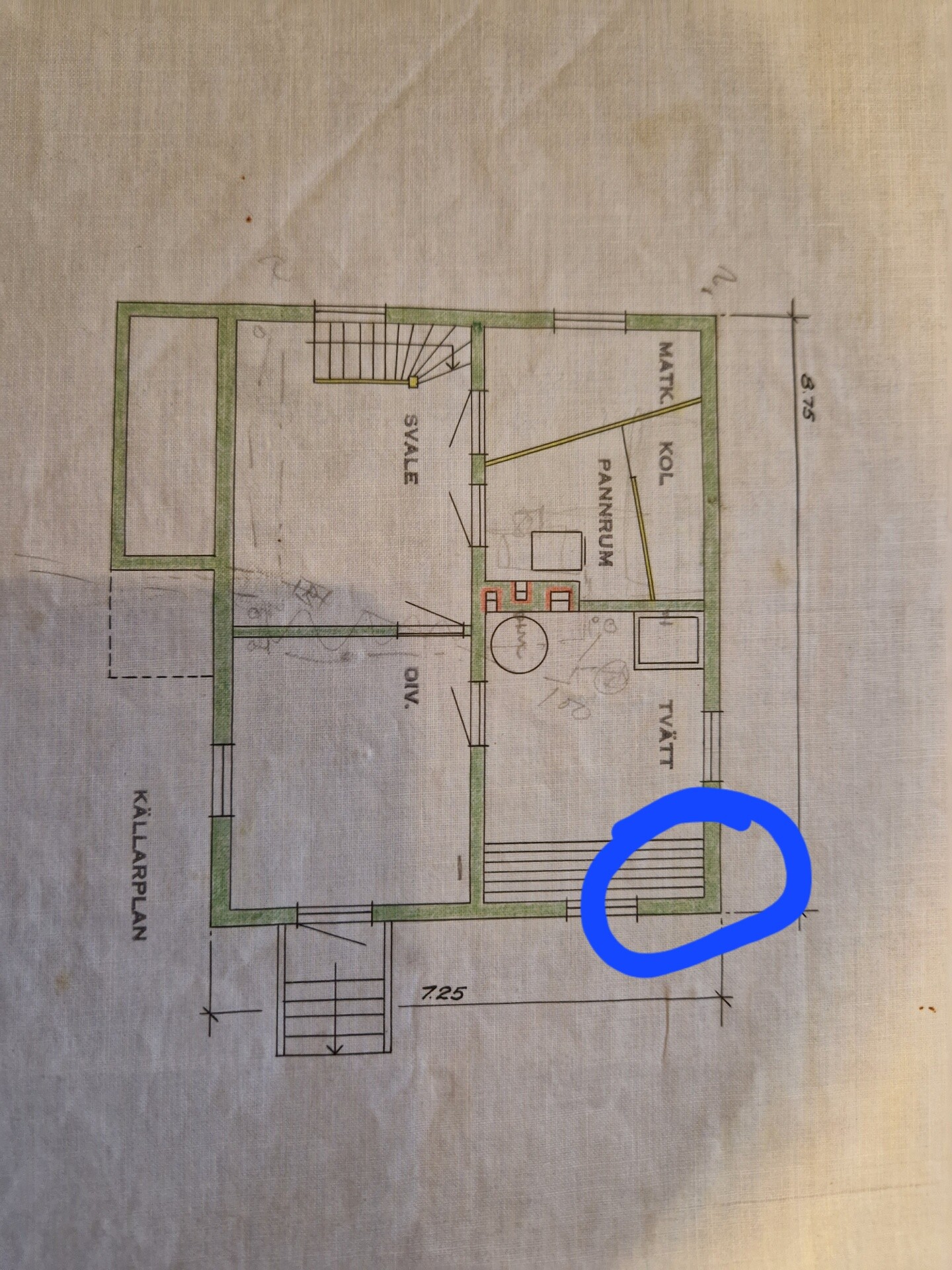 Vad kan det ha vart här tidigare? Varför skulle man ha "lagat" det så här klent. På orginalritningarna från 1938 så är det en tvättstuga då också, men jag kan inte se att något speciellt skulle ha vart placerat just i hörnen.