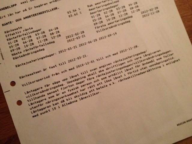 Förstår jag dig rätt när jag säger att du har delat upp ditt bolån i 5 delar och att förfallodatumet på 3-månadersräntan är 2012-05-02? Vågar jag fråga hur många tusenlappar respektive del är på?vithaken skrev:Band med SEB i fredags (och förhandlade villkoren för ca ett år sedan) och fick följande: