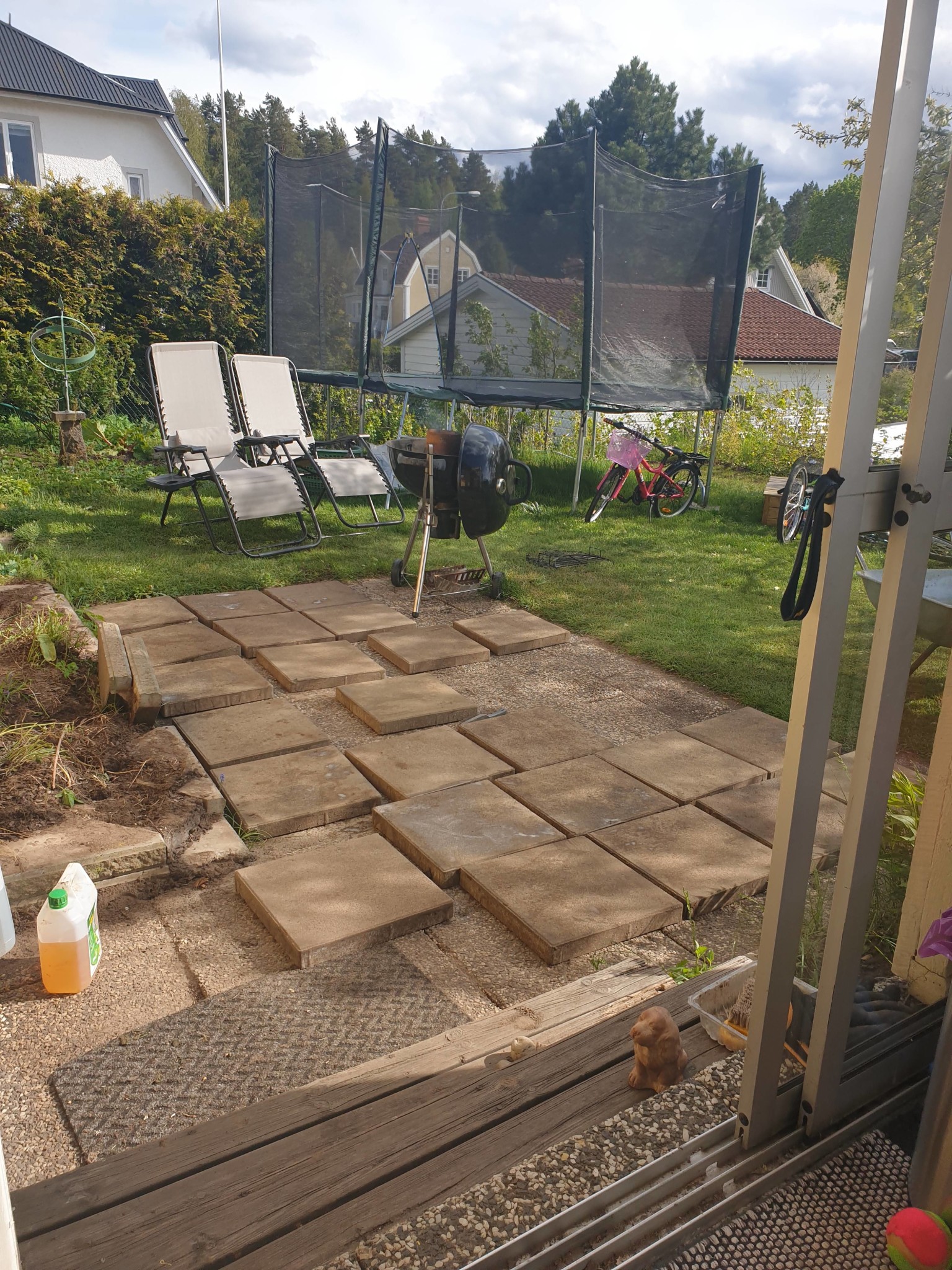 Tvättat stenar till den blivande nya uteplatsen. Vi hade 24 övervuxna stenar i ett hörn av trädgården, det är dessa vi nu har tvättat (se bild) och har kompletterat med 30 nya. Fullt medveten om att de kommer se olika ut. Dumsnåla? För mycket tid över? Miljötänkande? Avgör ni.