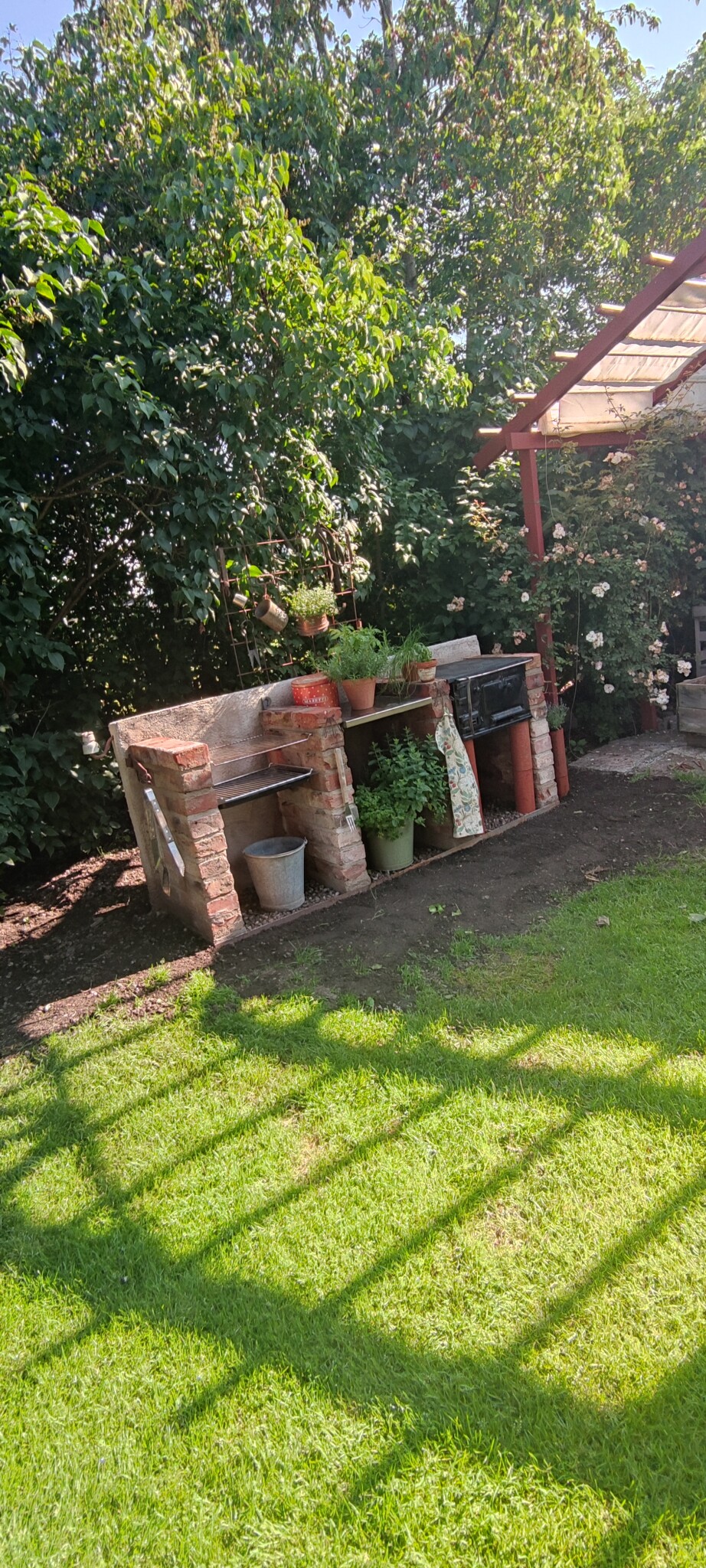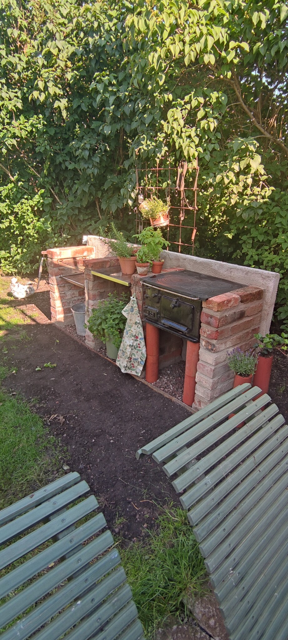 Håller på att slutföra ett utekök av hopsamlade saker som vänner skulle kasta, saker från grovsopor/tippen, loppisfynd och sånt som fanns i gömmorna.
