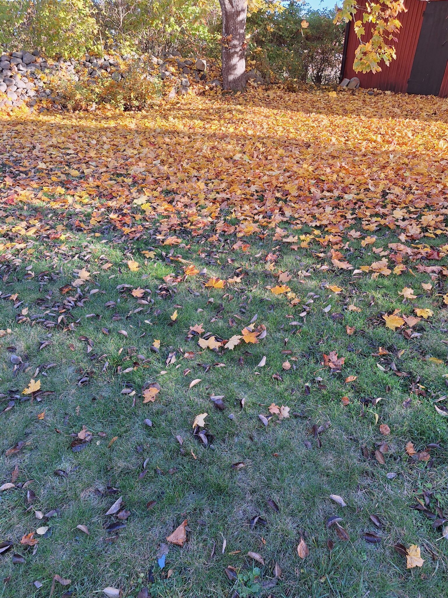 Den här taktiken funkar väldigt bra för oss. Klipp en gång utan uppsamlaren och sen en gång med. Om man samlar upp direkt går löven bara rätt igenom vår klippare och tar väldigt mycket plats, såhär kanske en tredjedel så mycket.