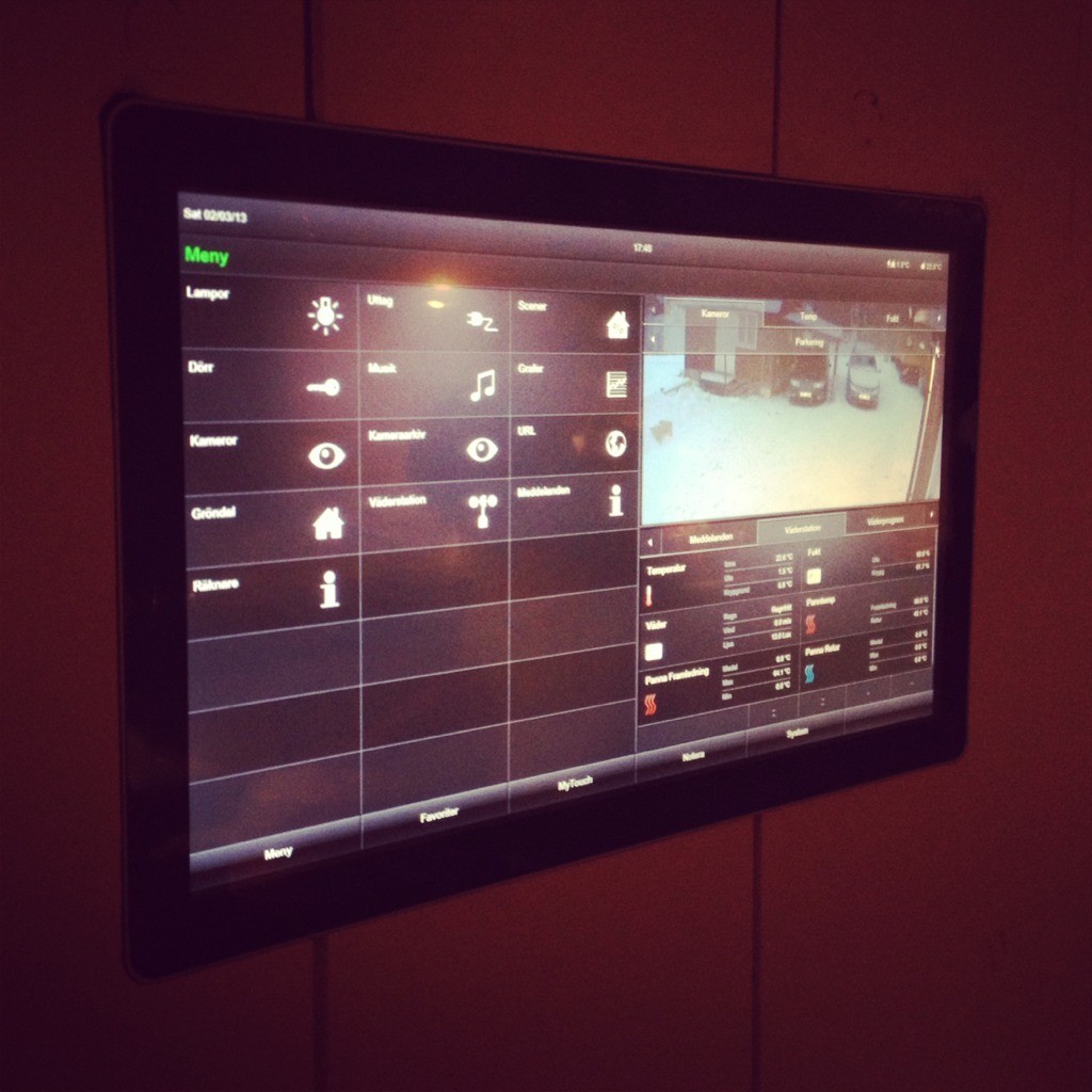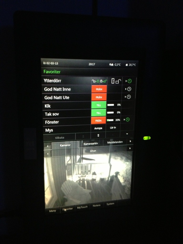 Har även mindre skärmar med samma GUI, denna lilla 7" touch (också med inbyggd dator) står i dagsläget lutad mot väggen på vår sänggavel, jag vill fälla in den mer permanent, men frugan vill inte såga mer i väggarna...