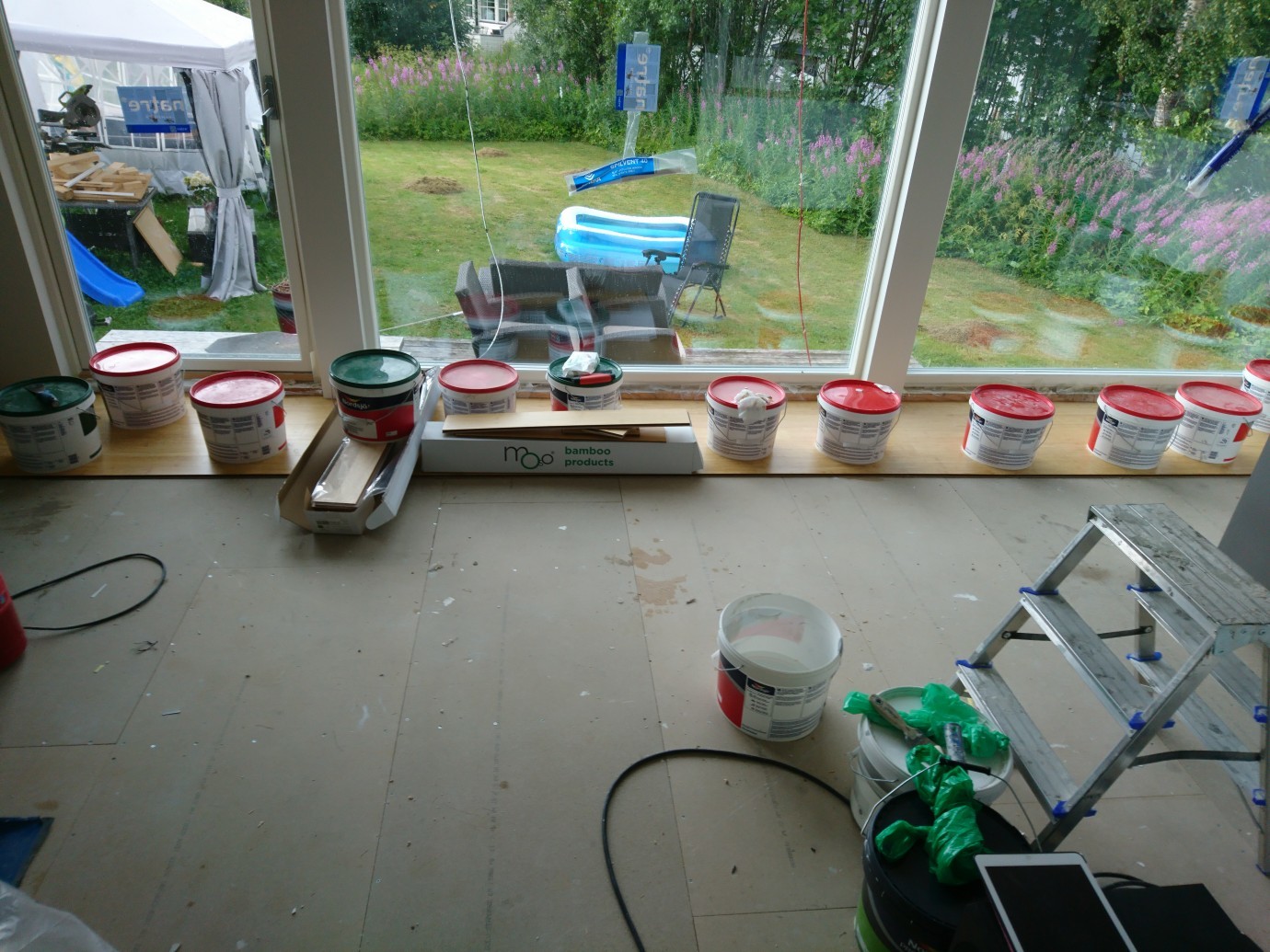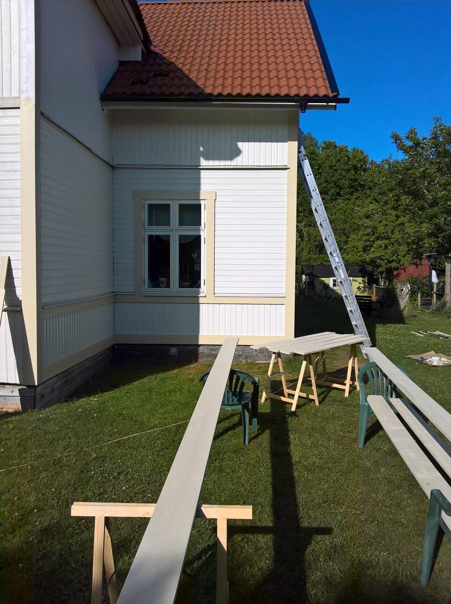 Den andra, inte surgubben, tog skruvdragare, kofot, hammare, utdragare, stegar och lite annat jox, i ren protest ställde hon sig i värsta solgasset, klättrade upp och ner, visade att hon kan själv.