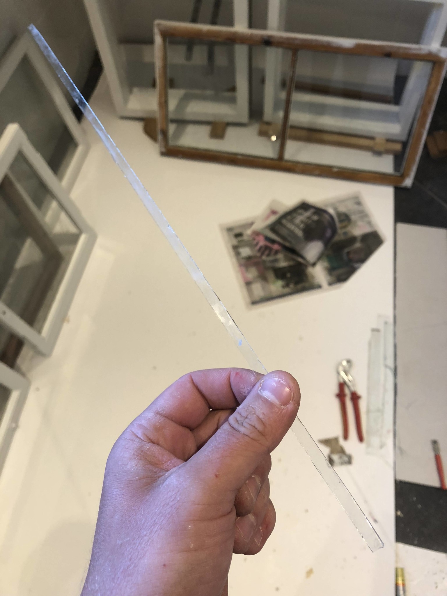 Hemma från jobbet idag, sjuk och eländig. Det enda jag orkade med vara att skära glas till de nygamla fönsterbågarna. Drygt hälften av glasen var trasiga och jag hade tänkt köpa nytt då jag inbillat mig att skära fönsterglas, speciellt smala remsor, skulle vara svårt. Men ack så jag bedrog mig, det var ju hur lätt som helst. 5 ersättningsglas tillskurna på några minuter!