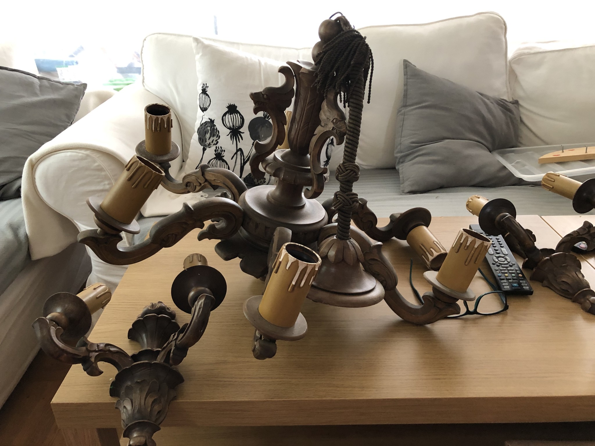 Hittade denna skönhet i trä med matchande lampetter som vi helt glömt bort då den inte passar i vårt hem. Borde väl finnas marknad fast den ser ut att komma från Game of Thrones.
