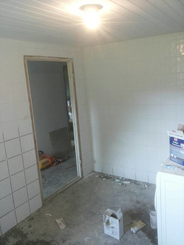 Gick sen in och målade väggarna i hallen på ovanvåningen. Drog om en telekabel också. Den hade tidigare suttit längs ett dörrfoder runt en dörr, men när väggen revs la jag ned en slang under golvet istället där den nu får gå.