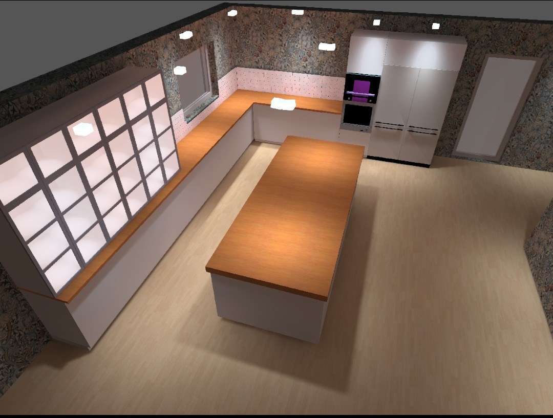 Går inte göra något med den delen tyvärr behåller ju gärna takhöjden så klart, men balkarna hamnar precis ovanför köksön, ocentrerat... tycker det skulle se lite lustigt ut. Matsalsdelen blir till vänster och där vi har tejpat på golvet blir köksön och kök i L-form mot yttervägg, ungefär så här:kashieda skrev: