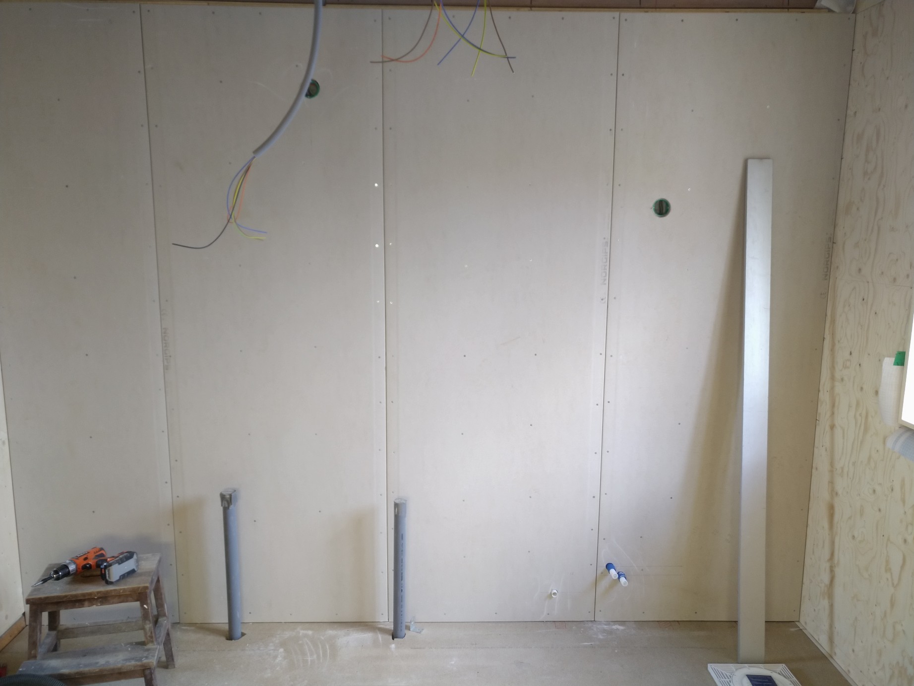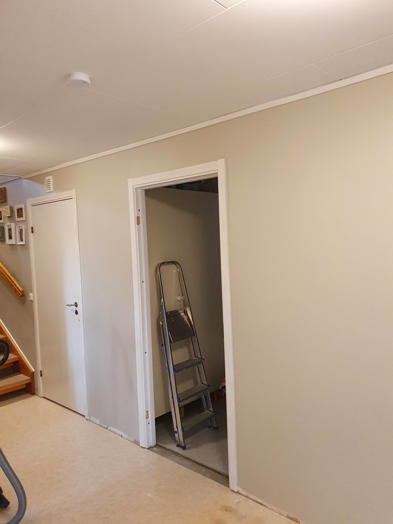 Tolvtimmarspass idag. Lillkillen vaknade 5:45 och klockan 7 målade jag första vändan. En tur till Bauhaus för mer färg och till Biltema för en ny halvljuslampa till Volvon. Lillkillen somnade på vägen hem. Lampbyte på bilen innan lunch. Andra strykningen efter lunch, sedan återmontering av element och taklampor, varpå följde grundmålning av taklister och två av dörrsmygarna inklusive foder. Avslut på dagen 19:15.