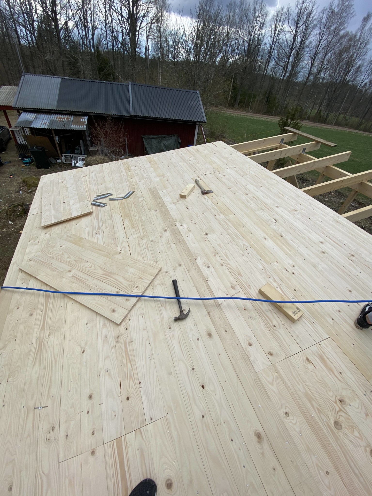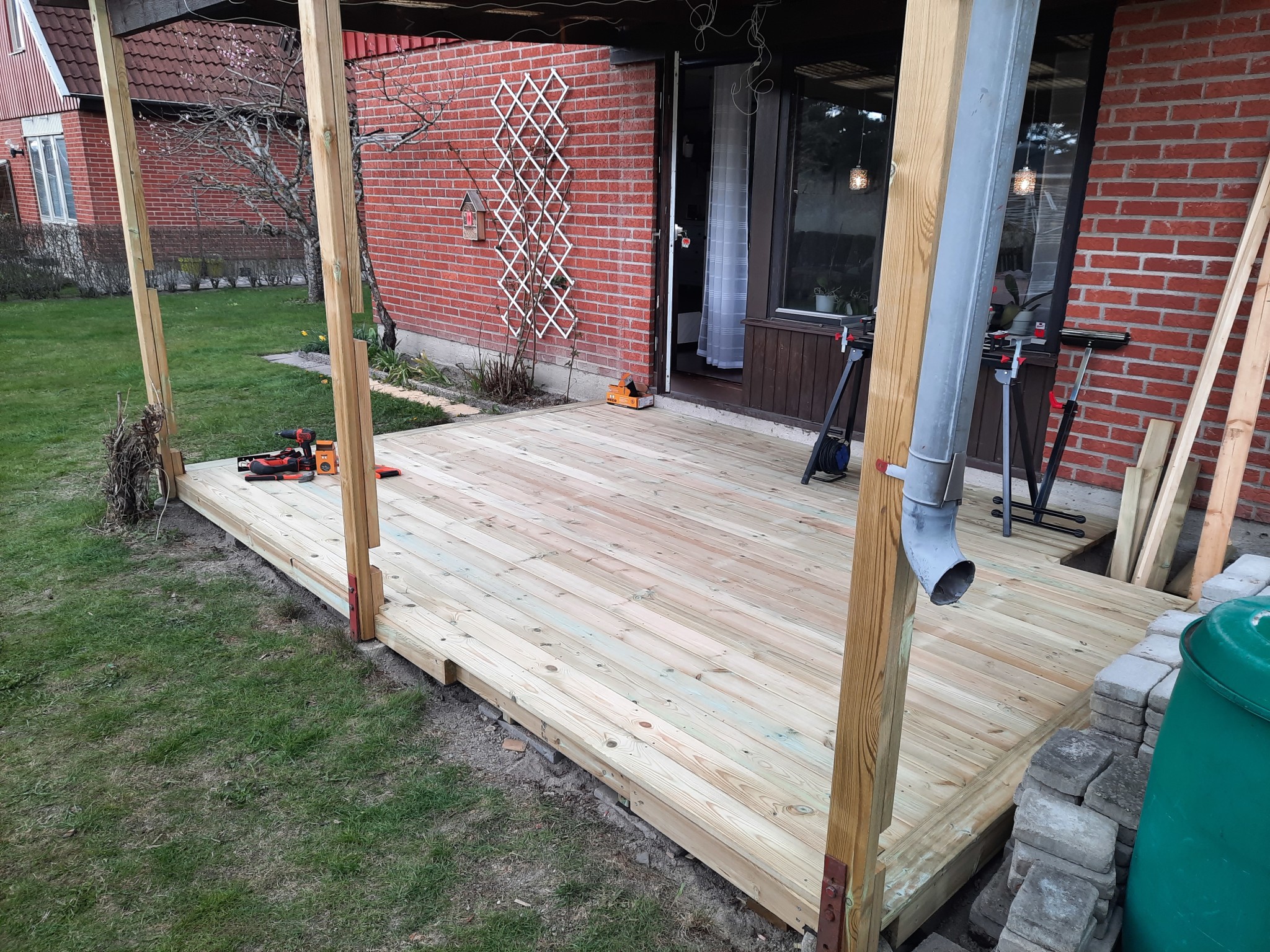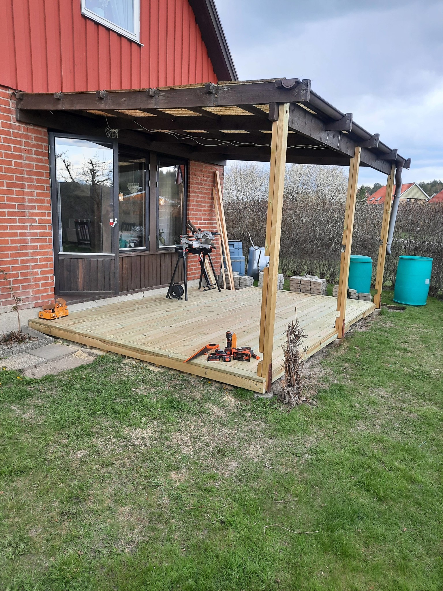 Nästa steg är att se så hålet är stort nog, sen i med fem cm stenmjöl, ovanpå det kommer en träningsmatta, inköpt från Biltema, för att få lite skönare botten, sen ställa dit poolen, regla upp för nya trallen, sätta några stolpar och sen tralla!