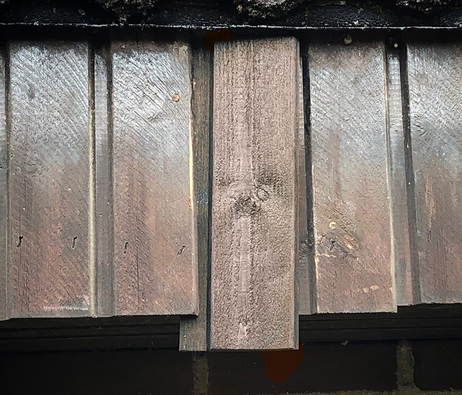 Nästa problem var att hitta rätt färg på de panelbrädor jag fick ersätta. Misstänker de gamla är målade med brunsvart Cuprinol och jag hade bara Beckers. Tidigare test på färgblandning för det brunsvarta inne i huset blev två delar svart och en del brunsvart Beckers, det gav identisk kulör. För panelen ute blev två delar brunsvart och en del svart bäst. Intressant är att på bilden ser de gamla blankare ut men i verkligheten är den nylaserade blankare. Men jag är nöjd.