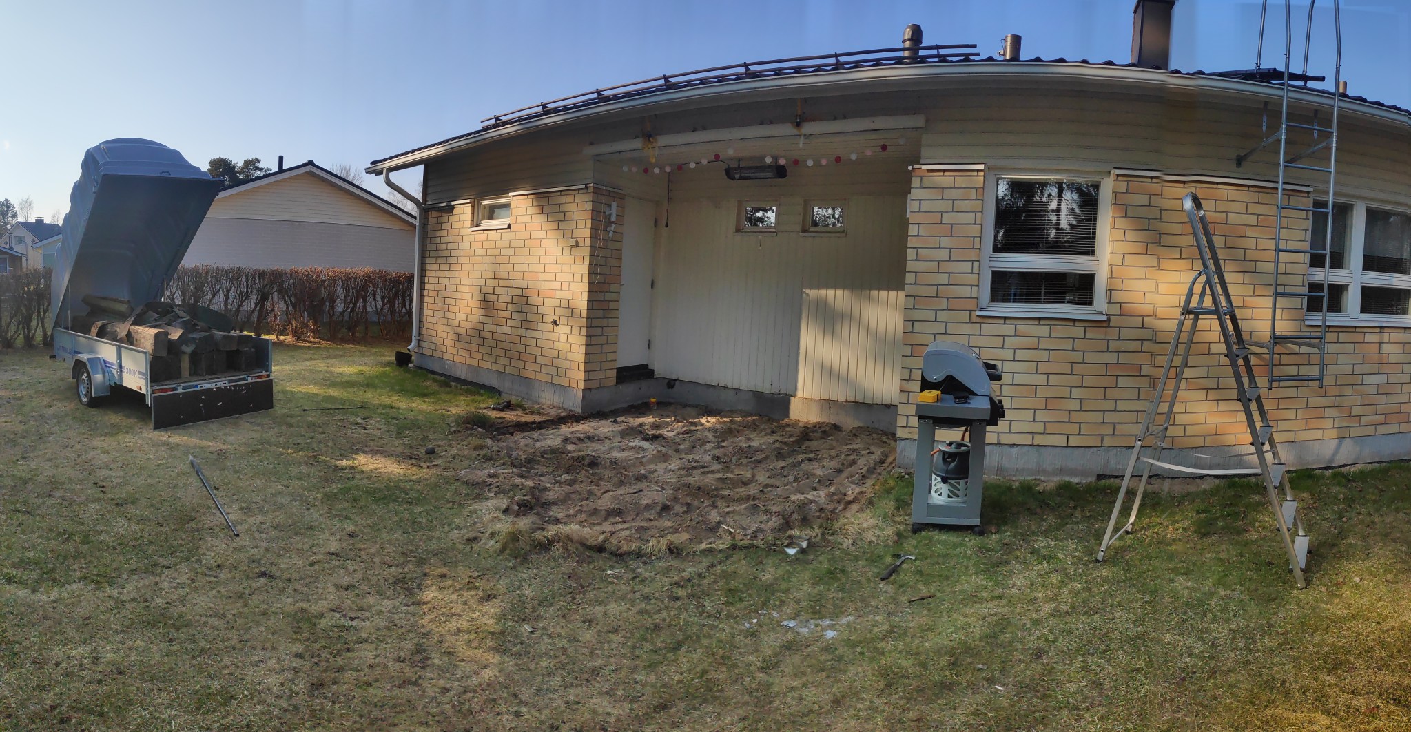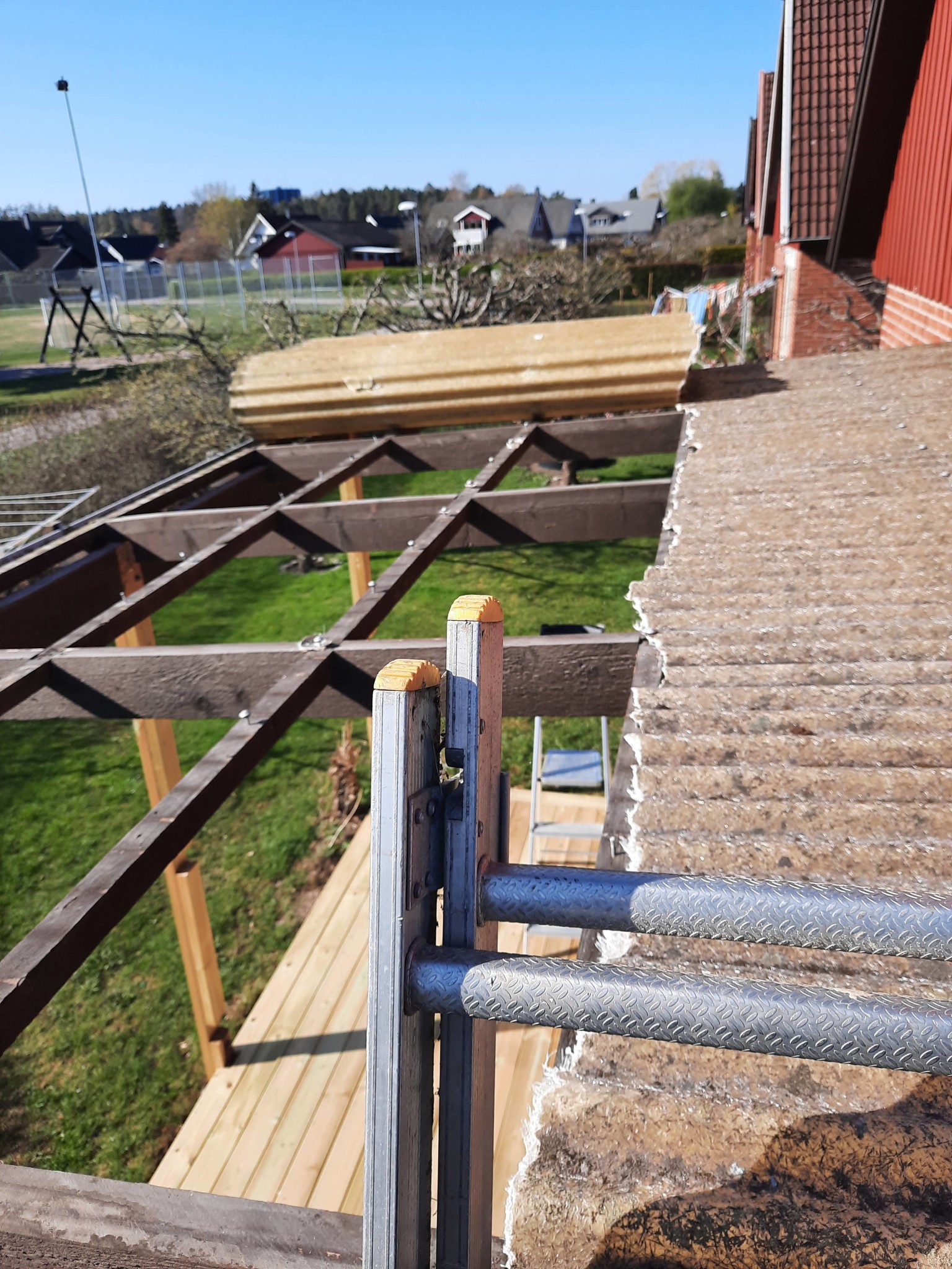 Tänkte att detta fixar jag över en helg, jo tjena. Förutom att jag inte är särskilt duktig så satt de gamla fast med rostiga skruvar in under pappkant och takpannekant så det visade sig att jag fick kapa 48 skruvar med multicuttern. Funderade på att lyfta av pannorna men det kändes alldeles för bökigt. Provade också att spräcka panelen vilket var enklare men jag ville helst behålla de gamla brädorna.