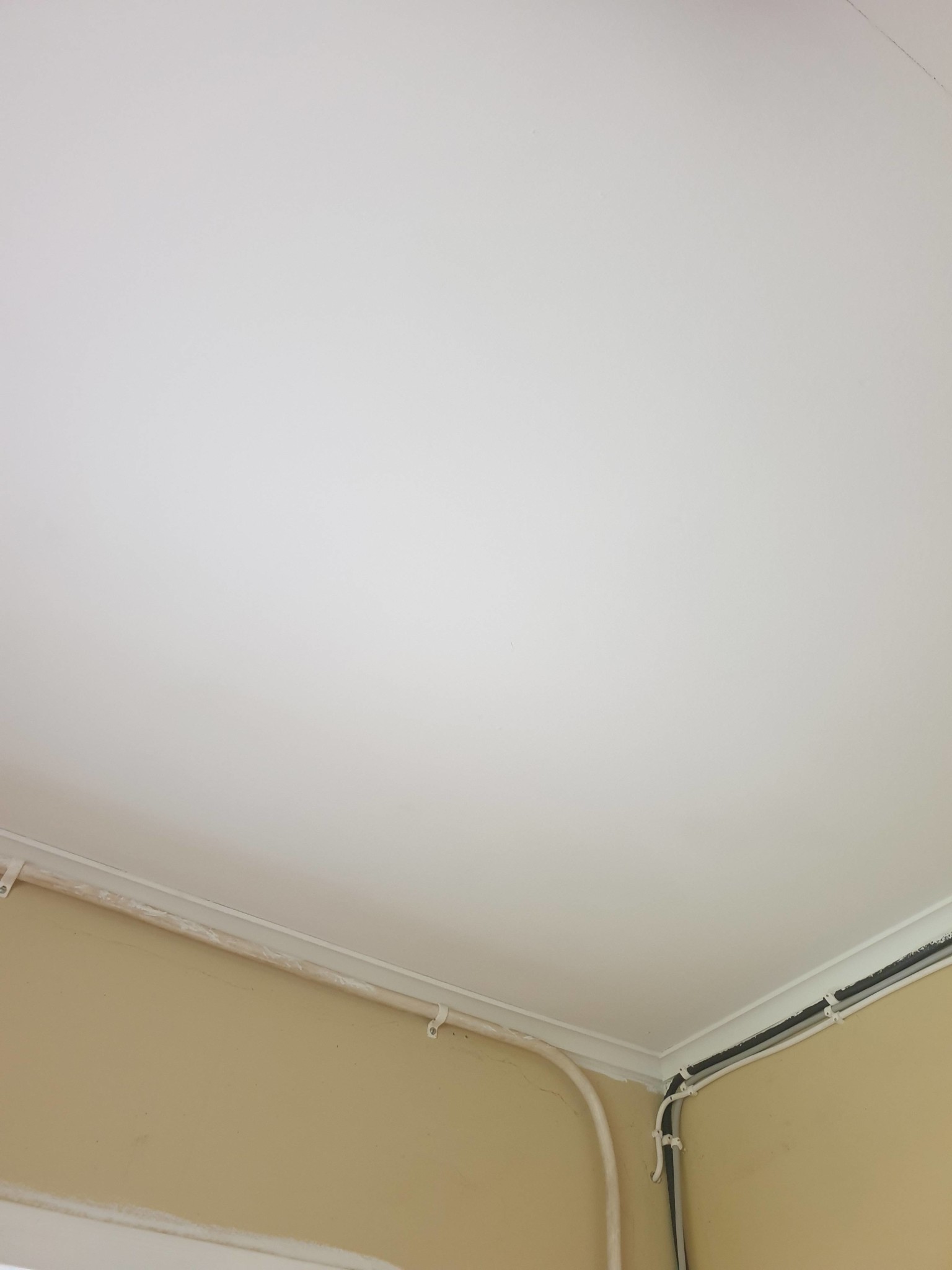 Målat tak för första gången i mitt liv. 6 kvm, stående på en stege med vanlig kort roller. Halvjobbigt faktiskt. Körde ett varv med lackfärg på fönster och dörr också. En gång till, sen får det vara good enough.