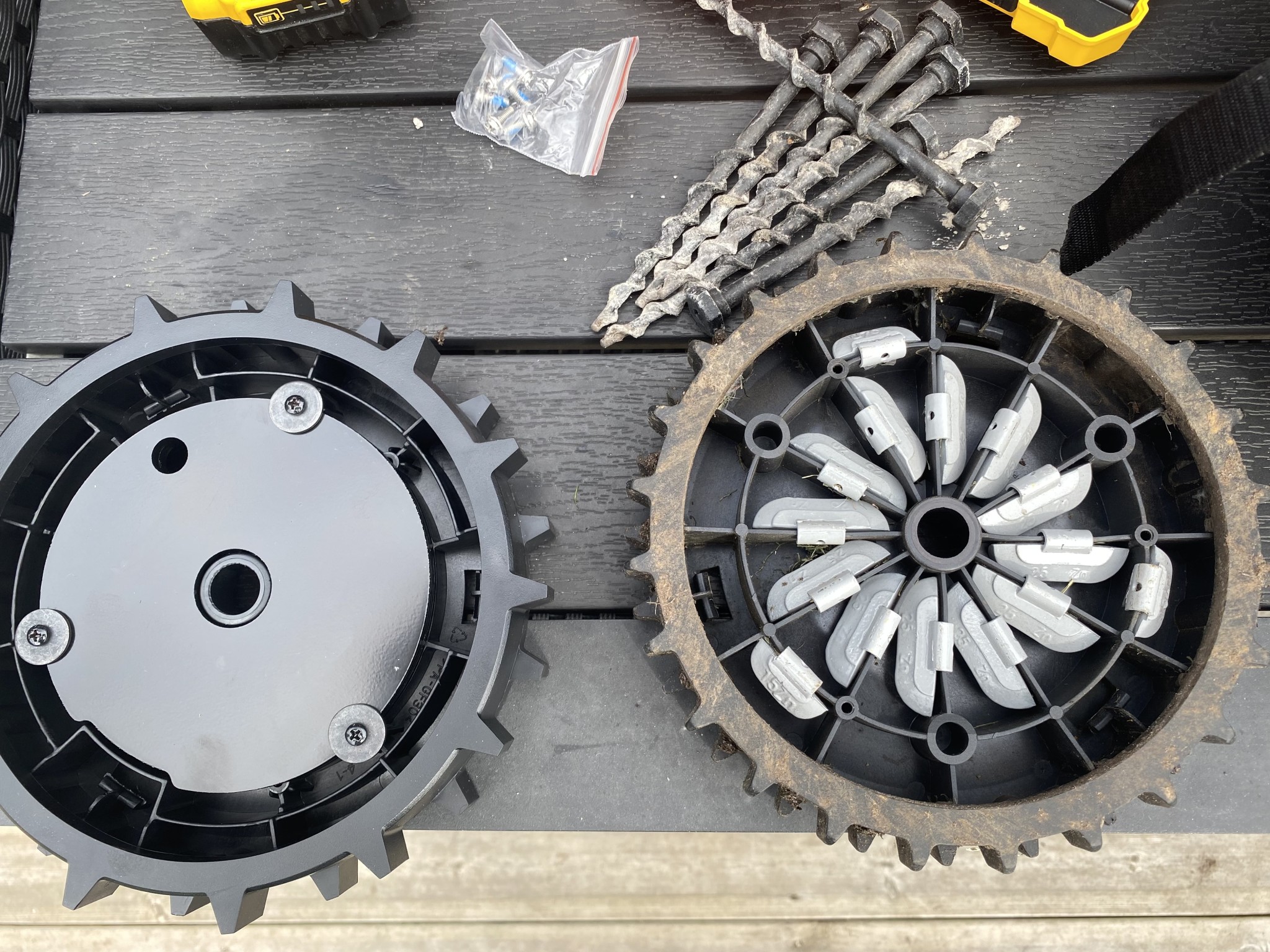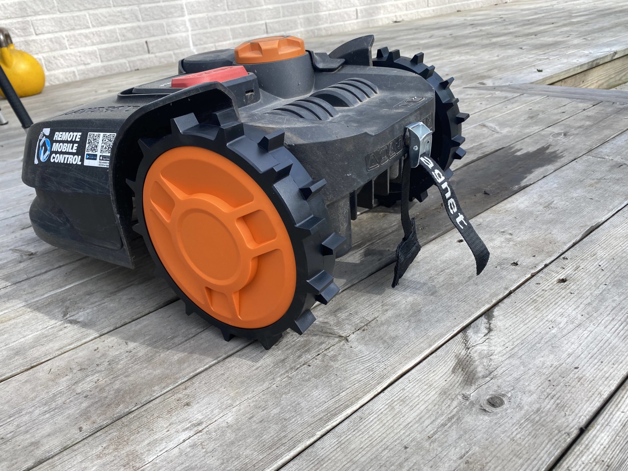 Robotgräsklipparen har fått riktiga "off road-hjul" i stället för dom lite mer modifierad original-hjulen. Samt en magnet som plockar upp trasiga blad och annat spännande från gräsmattan ...