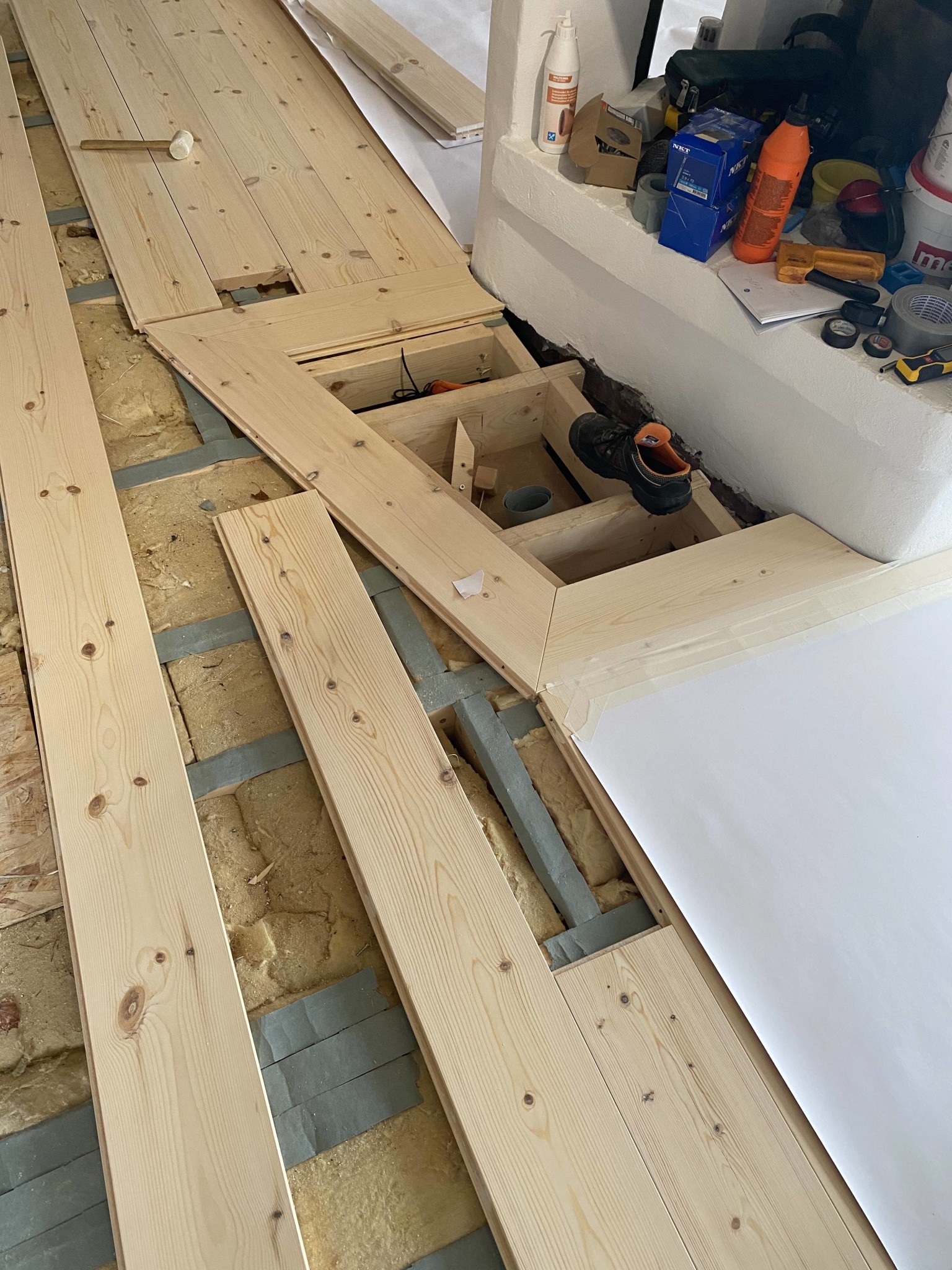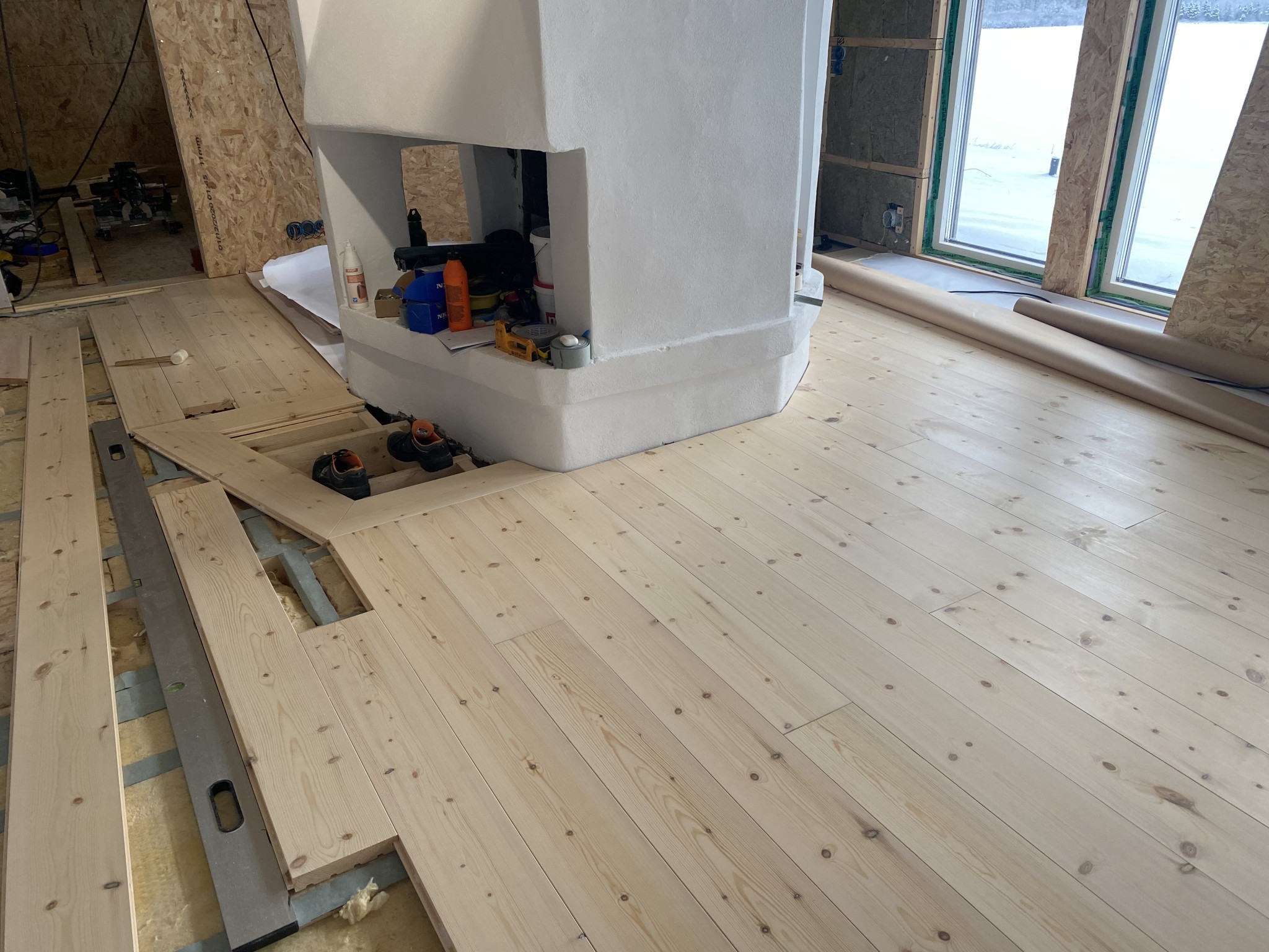 Fick välbehövlig hjälp av sambons pappa i tre dagar att lägga golvet såhär långt. Blir mycket pill och mätande i och med att jag ”måste” ha träramar runt hallen och öppna spisen.