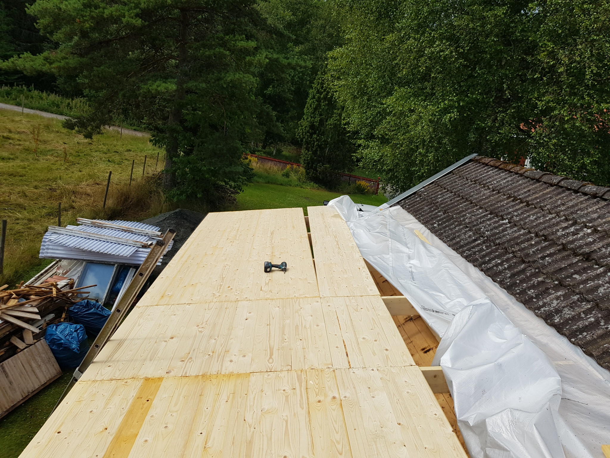 Idag åkte råsponten på taket. Efter middagen gick jag ut och kapade takutsprånget till rätt mått men det tog jag ingen bild på. Grabben levde sitt liv i jordhögen berdvid.