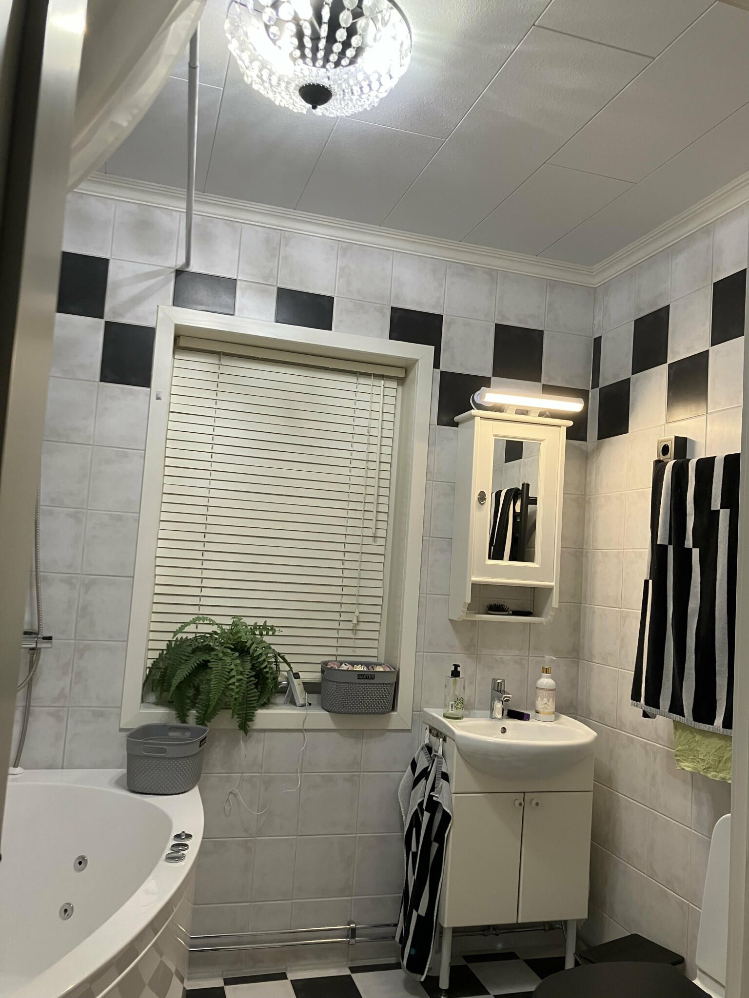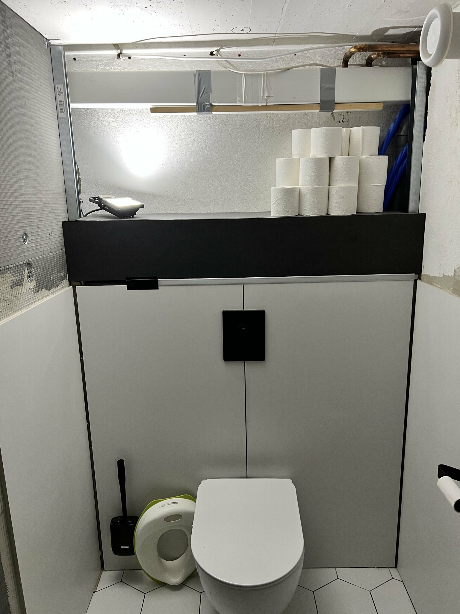 Problemet med belysning pÄ skÄpet löstes med Plejd. En takdusch har tillkommit. Toastolen fick en riktig skarv istÀllet för den hemgjorda.