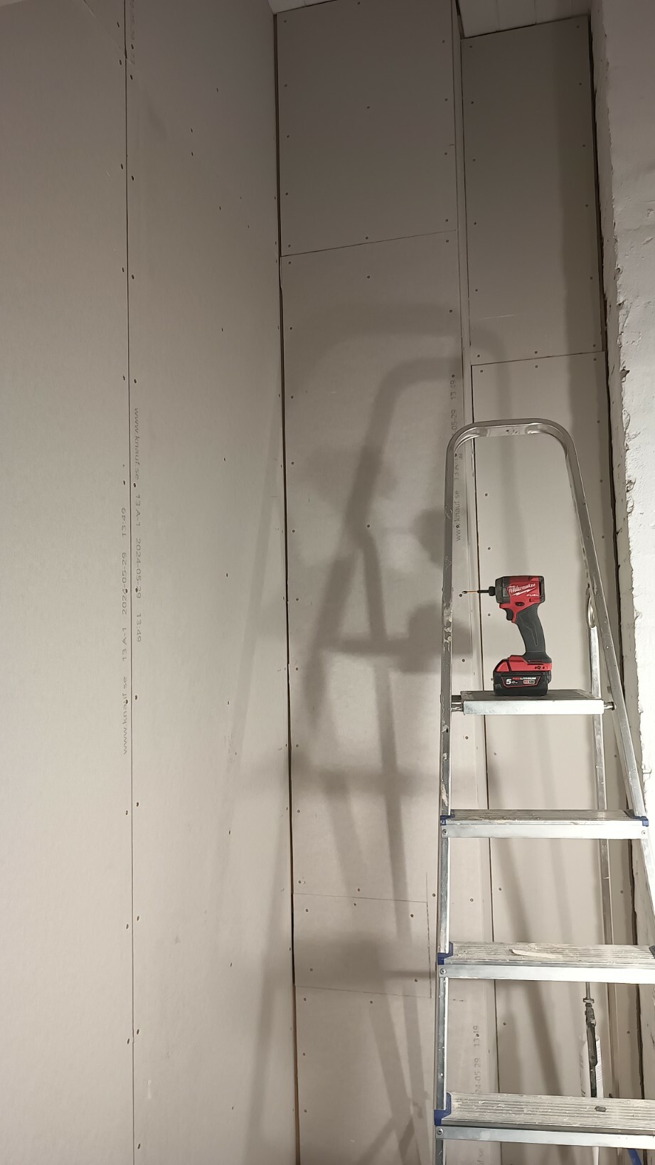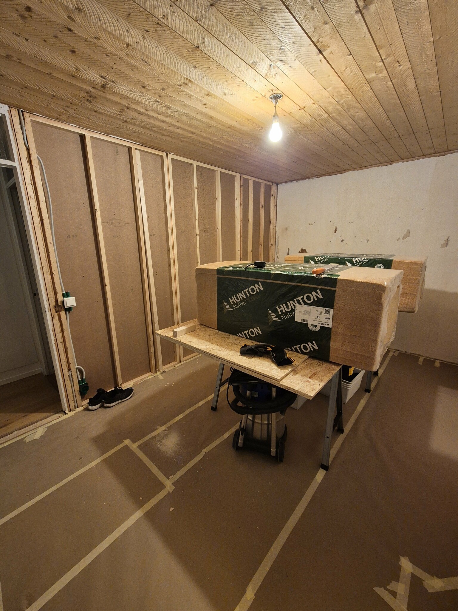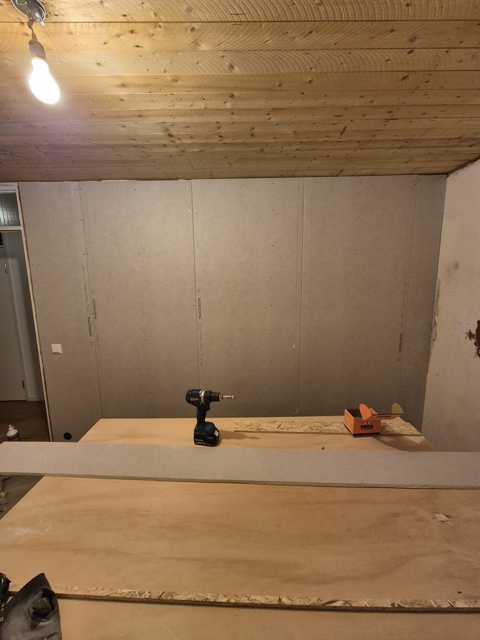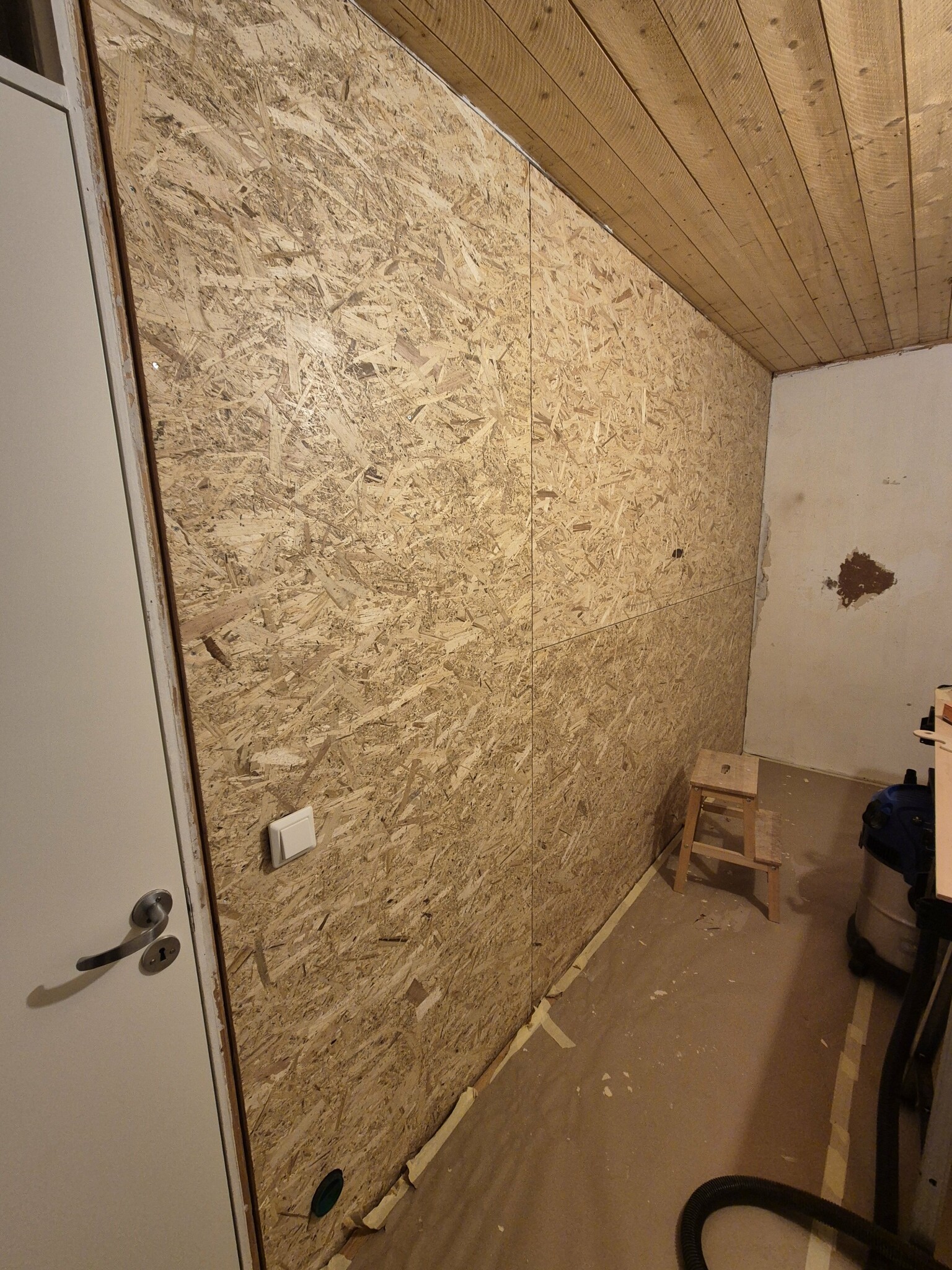 Frugan börjar tröttna pÄ OSB-vÀggarna och avsaknaden av hyllor i klÀdkammaren. SÄ det var bara att tömma och börja gipsa.