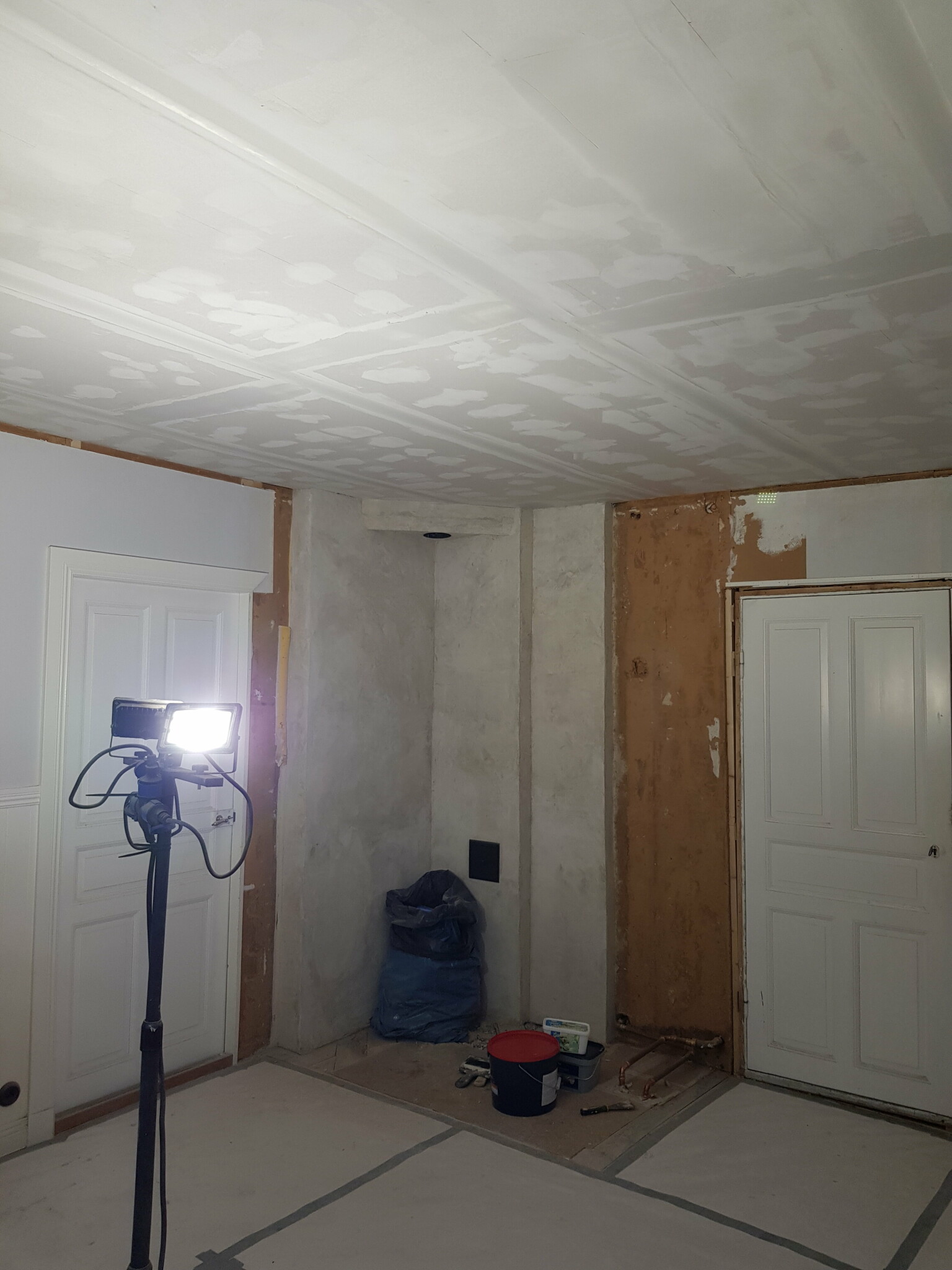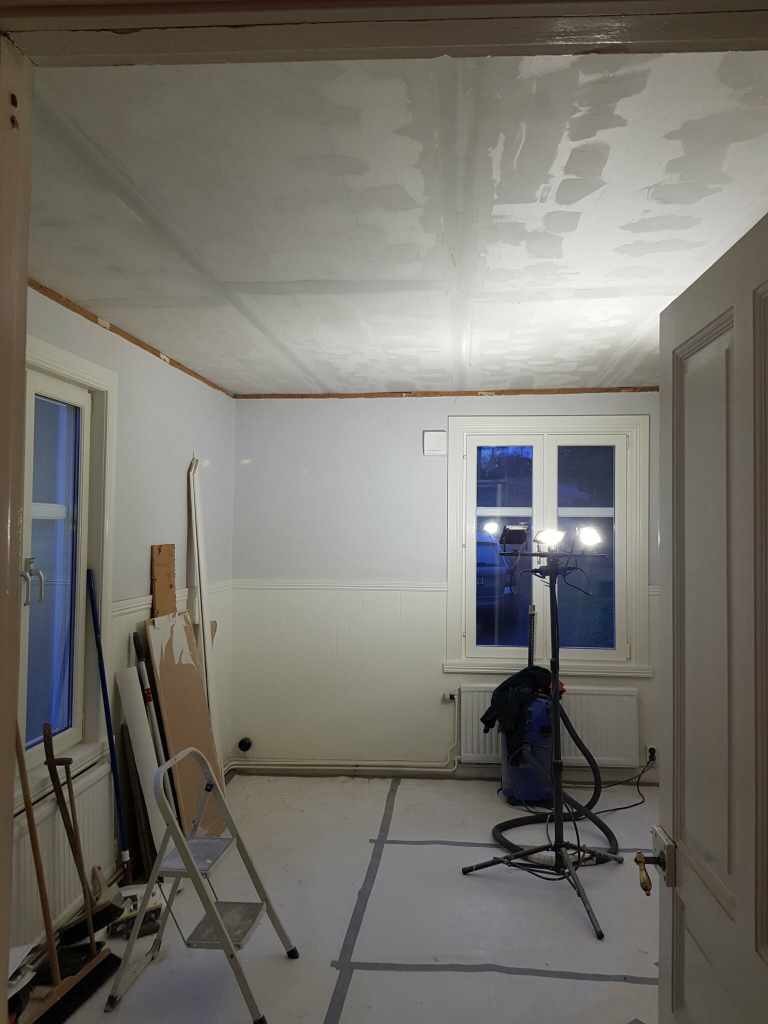 PÄbörjat spacklingen av taket i finrummet. Devisen Àr att hellre spackla Àn slipa sÄ Àn Àr det nÄgra lager kvar innan det Àr dags att gno.