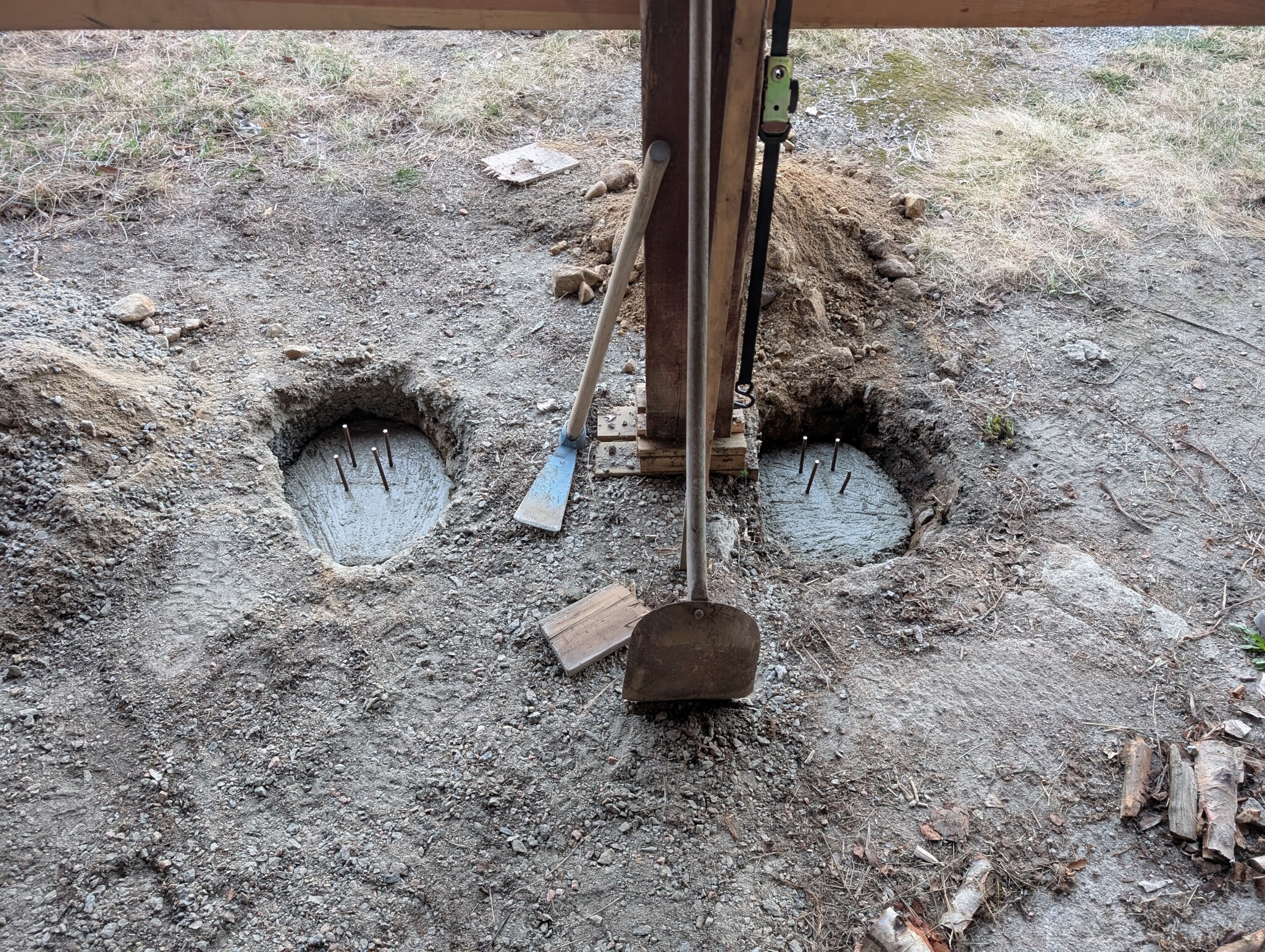 Tänkte bygga ett litet väderskydd till traktorn, men blev varse att stolpen som bär upp taket inte når ned i marken! Blir nya stolpar av 2st 63x125 skruvlimmat. Tyvärr sitter befintlig stolpe precis i en skarv, därav två stolpar.