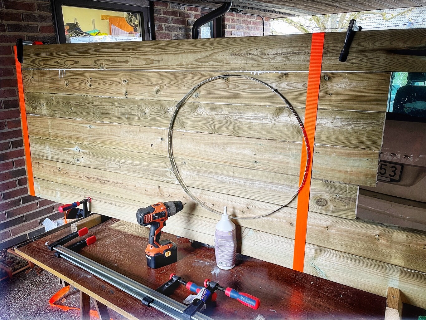 Metallbandet visar ungefär diametern på vad jag skall såga ut för webern. Metallbandet skall sedan skruvas på insidan av hålet för att minska risken att de korta brädbitarna kan lossna. Tar det pö om pö så efter påsk bör jag vara klar.