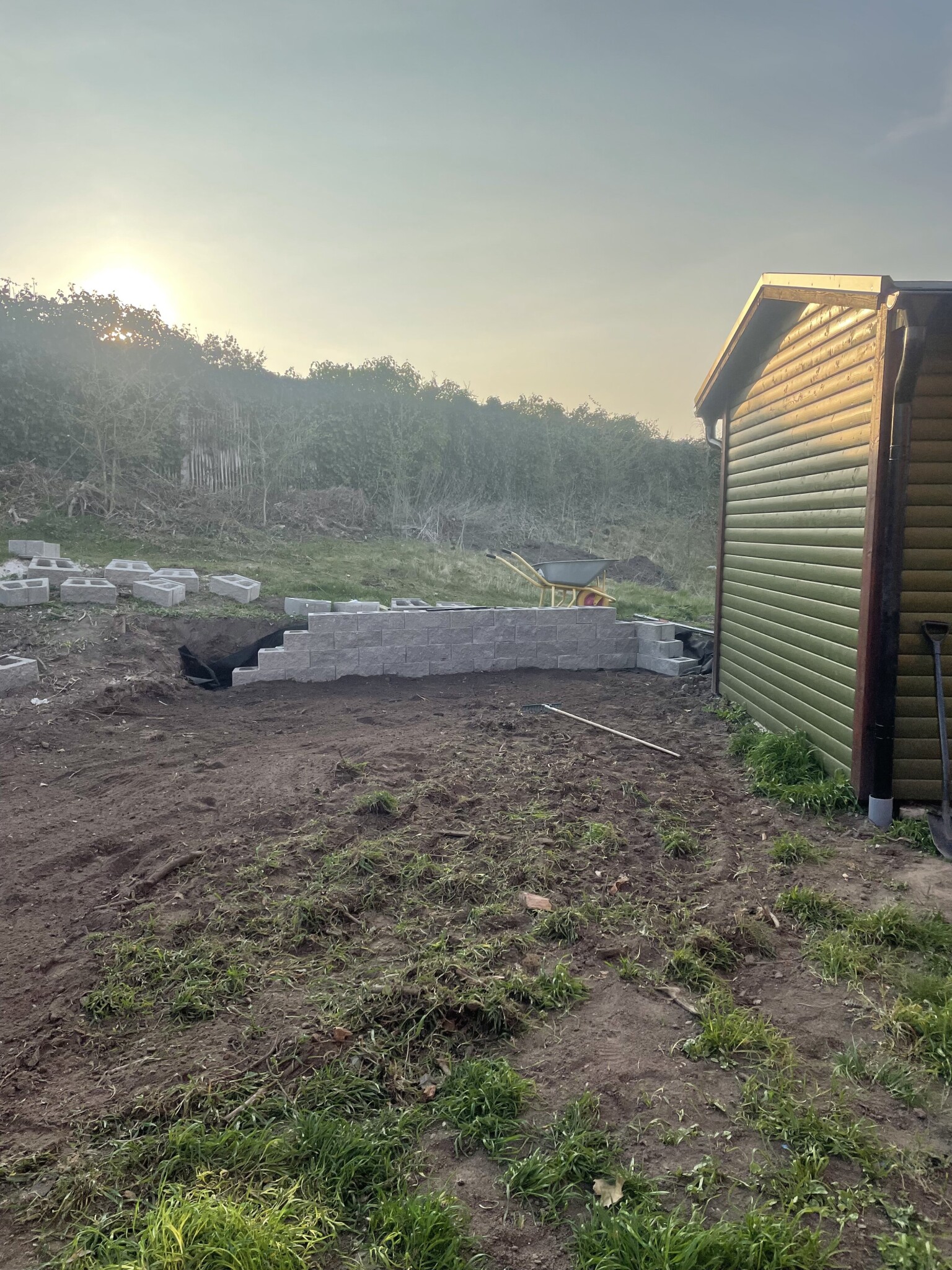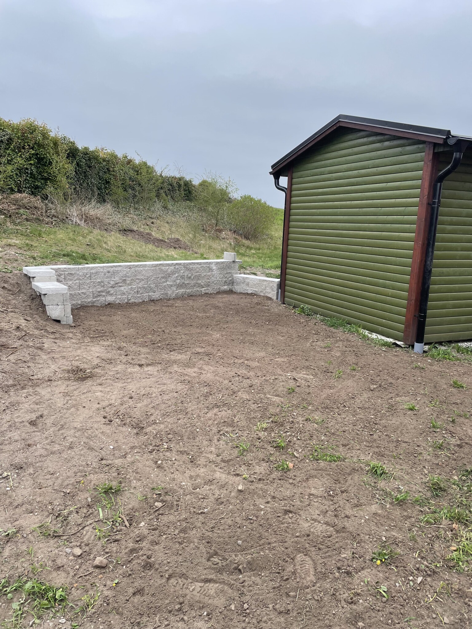 Byggt nivå mur då jag var trött på att ljudvallen kryper längre och längre in på min tomt varje år blev många ton jord att flytta