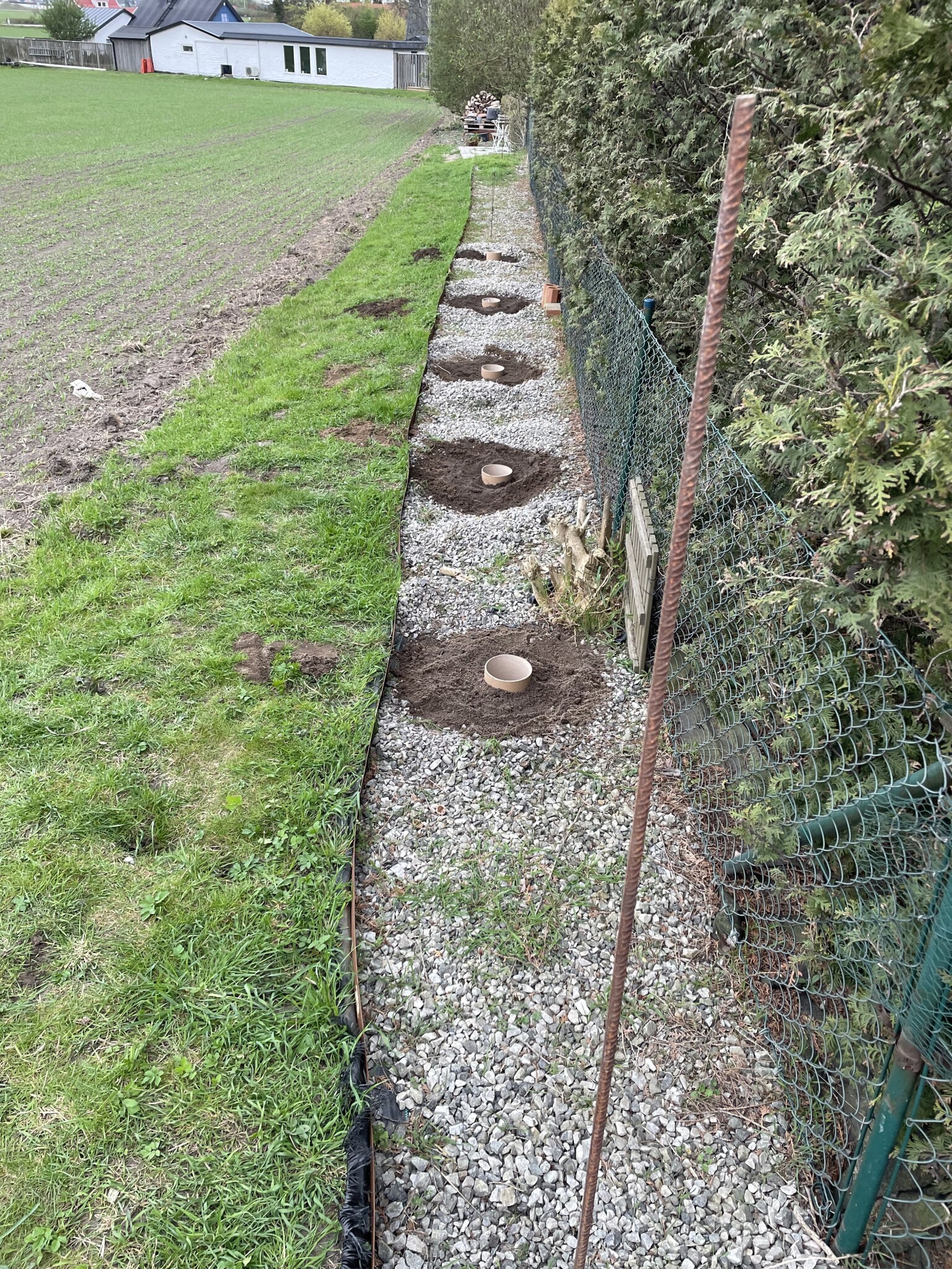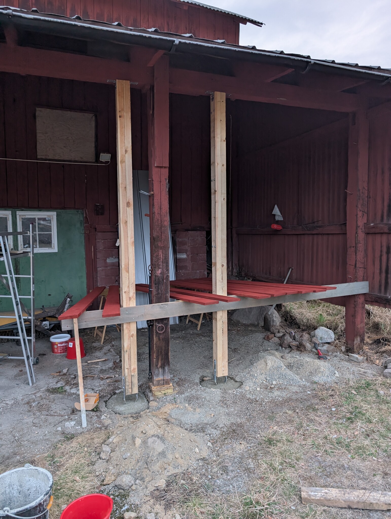 Gjutit fast två stolpar till traktorgaraget samt målat tio brädor. Den röda stolpen mitt emellan de vita skall bort, den når inte ens ned i marken. Den högra röda skall kapas och ett stöd skall gjutas. Det var en dålig idé att gräva ned en bit...