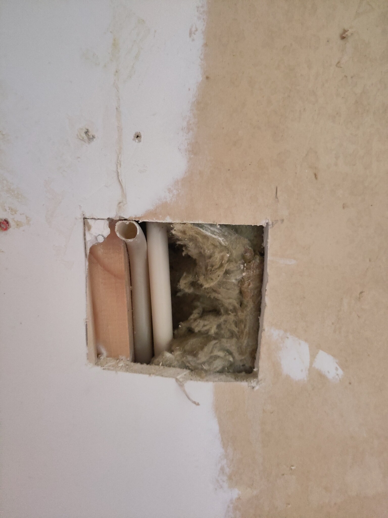 Innegivaren till förra värmepumpen satt här, så det blev lite titthålskirurgi för att dra upp röret till vinden och istället få ner nätverk till nya pumpen.