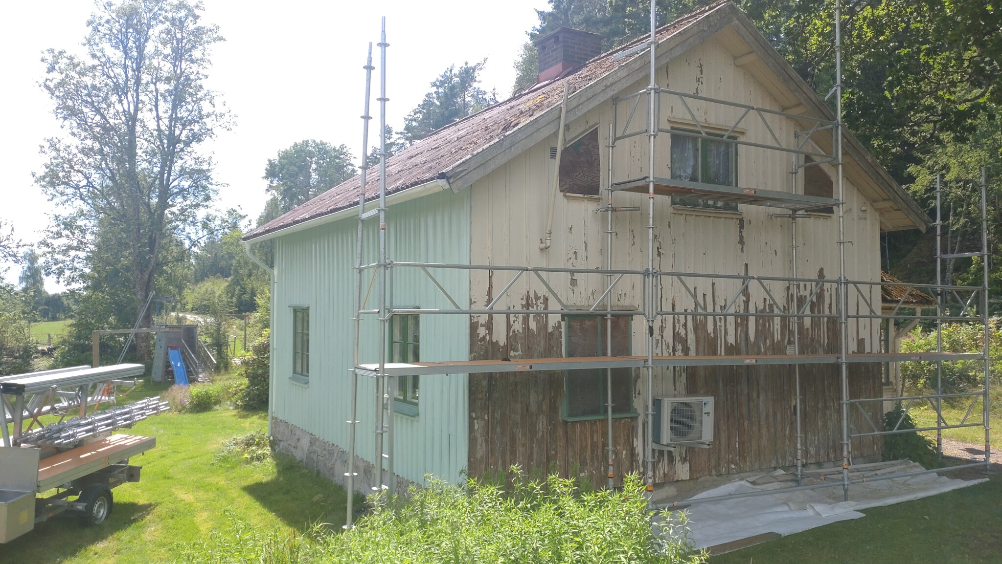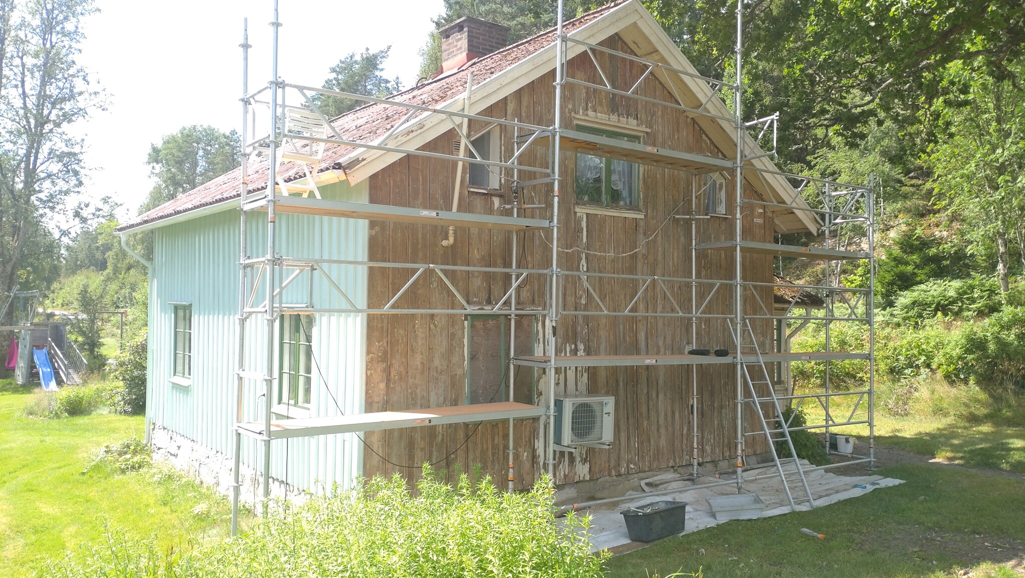 Med de senaste somrarnas väder i minnet har linoljemålaren lärt sig att jobba av årets vägg på stugan när det är uppehåll. Oaktat om det är 27, 29 eller 30+ grader. Så i denna veckan har det blivit grispass på ställning med att riva locklist, skrapa trärent, grundmåla, spika hattläkt och påbörja mellanstrykning (värmepumpen ska flyttas när en fläck under fönstret är klar).