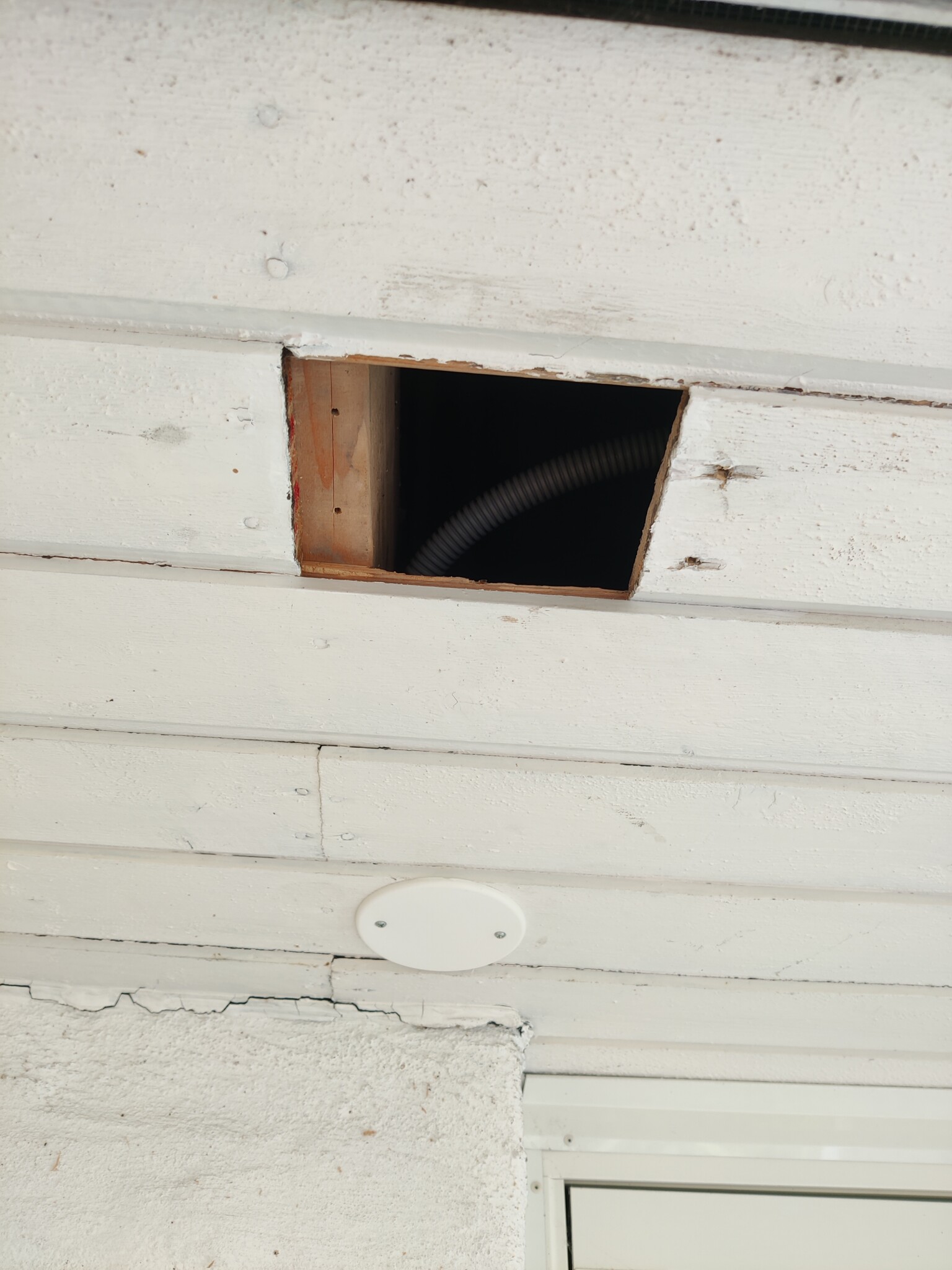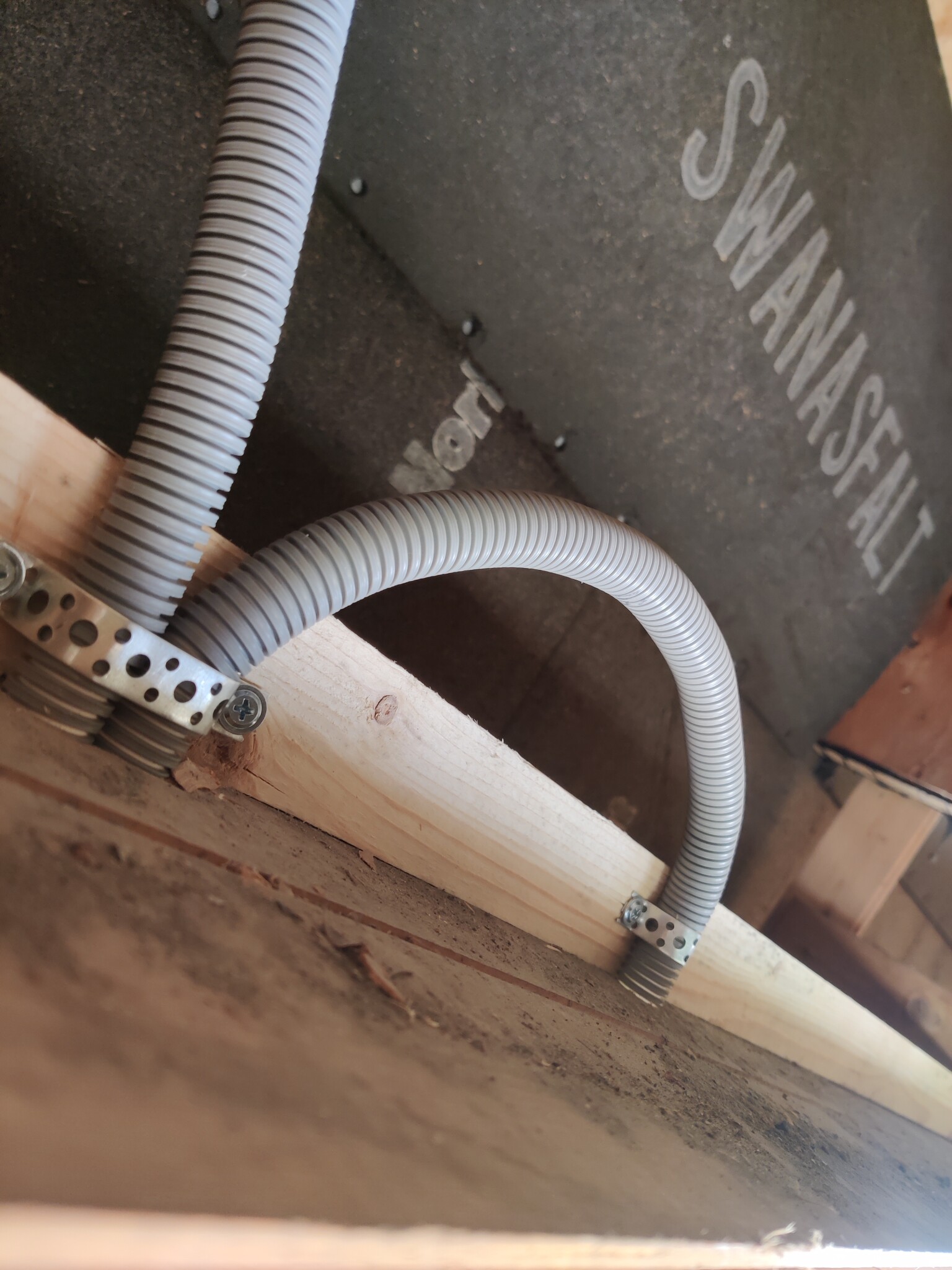 Med panelbrädan borta kom nästa utmaning, få genom något upp till vinden som man kan dra fram flexslangen med. Vanligtvis brukar det gå bra med stålmåttband som man kan mata fram, men icke, fastnade efter 3 meter.