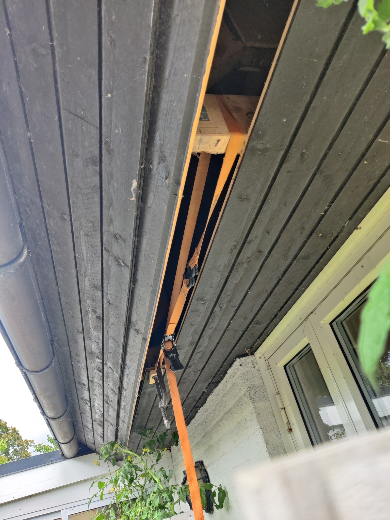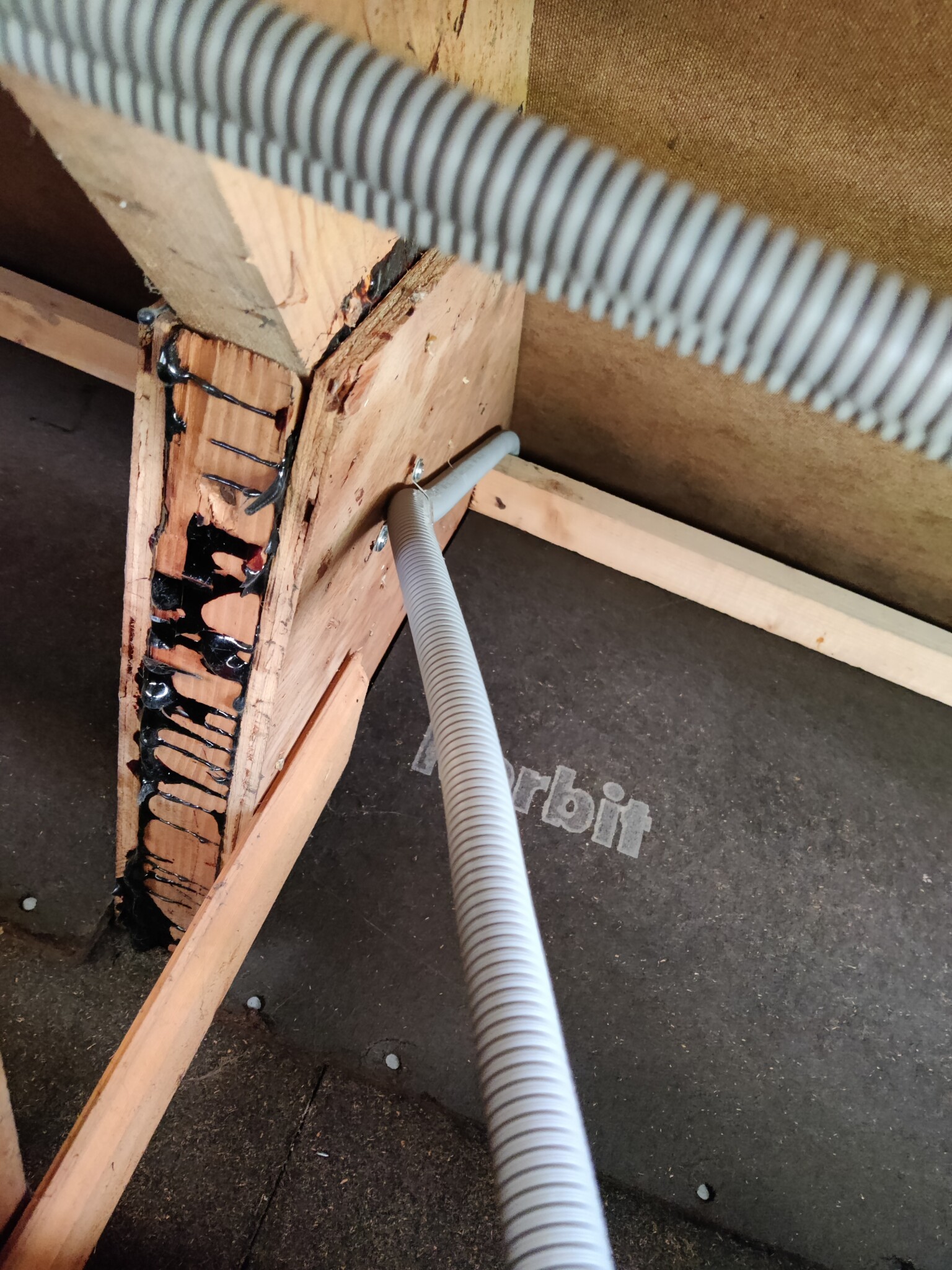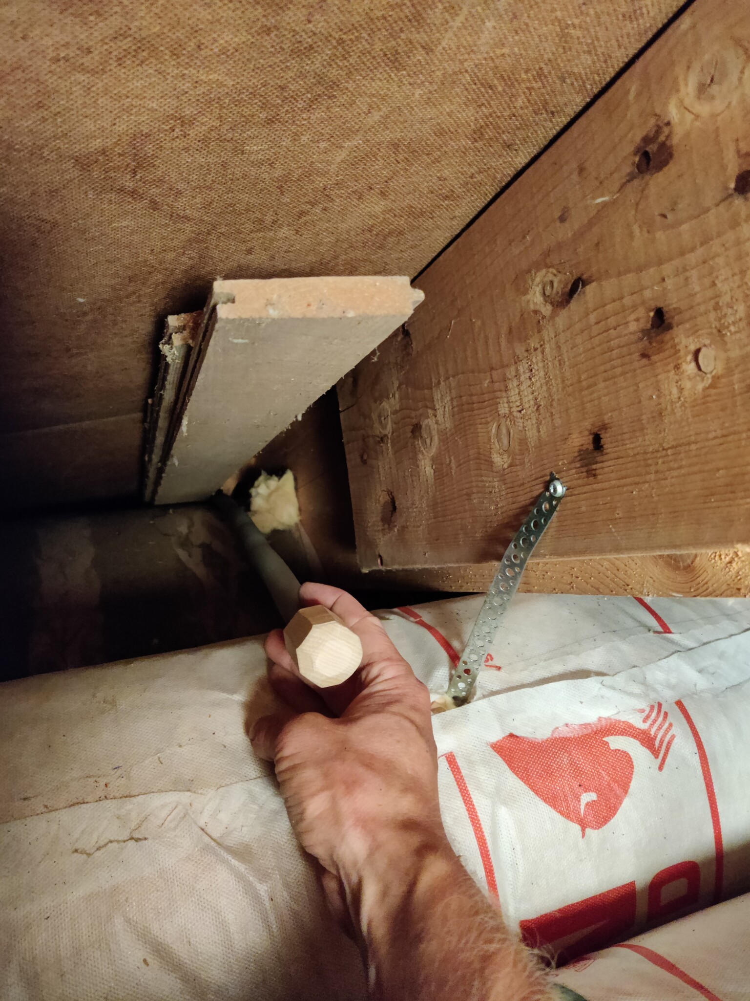 Planen var att dra en flexslang från takfoten upp till vinden längs med takstolen. Men, först behövde jag ta bort lite panel så att jag kom in i takfotslådan. Fram med ett av mina favorit verktyg, Bahco 38 så att spiken kunde plockas ur hyfsat snyggt. När väl en panel var nere kunde jag dra ur ytterligare en panelbräda som satt klämd under uterumsväggen. En c-tving och spännband kunde jag sakta dra loss den: