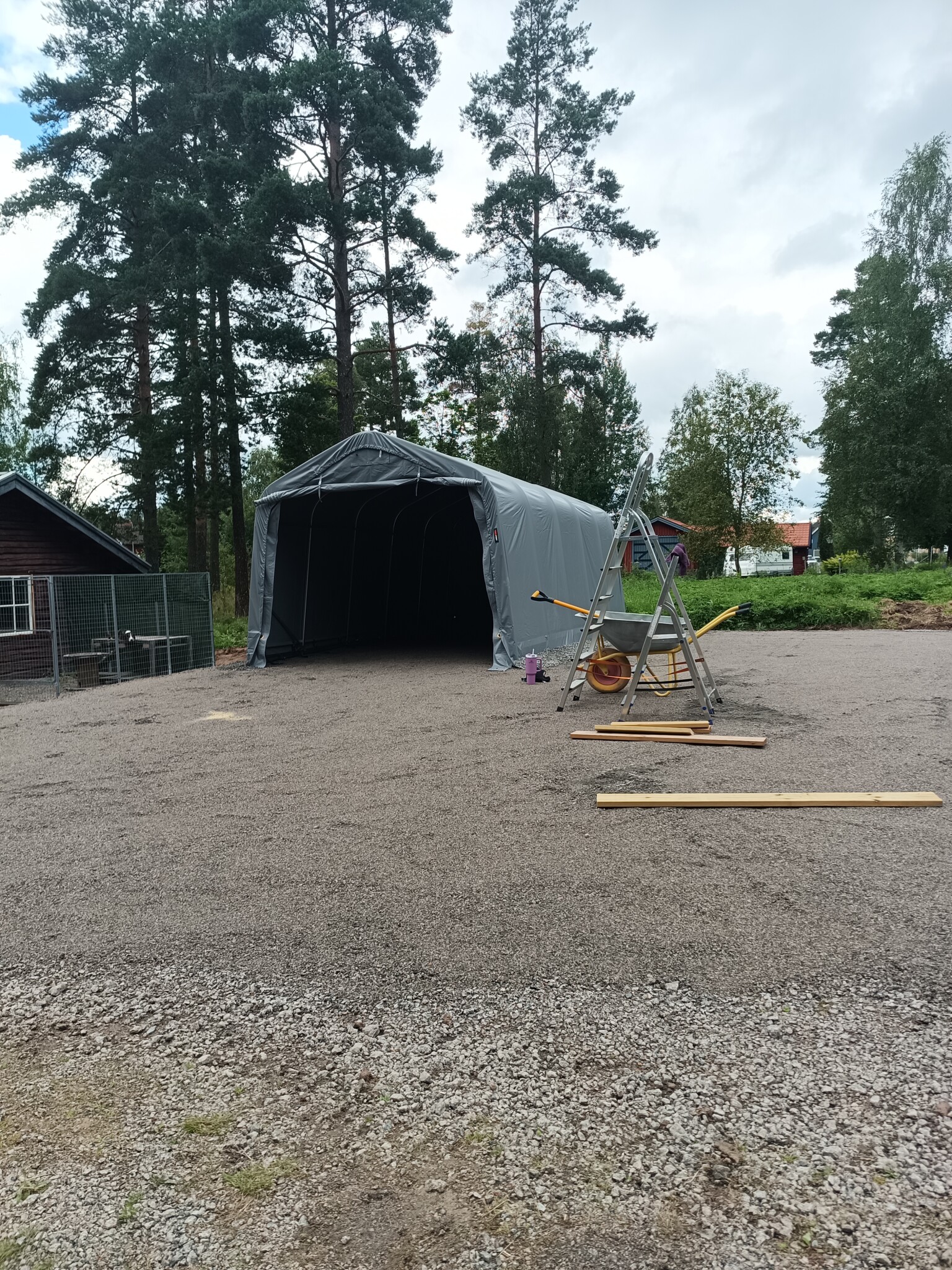 Första tältet klart, enda som återstår är velysning, men det ordnas när båda tälten är uppe, blir skarvsladd från garaget ut, 400v till en byggcentral i första tältet, sen skarvsladd till nästa. En art första tältet ska ha uttag för motorvärmare. Lysrör i led kopplas via jordat schuko.