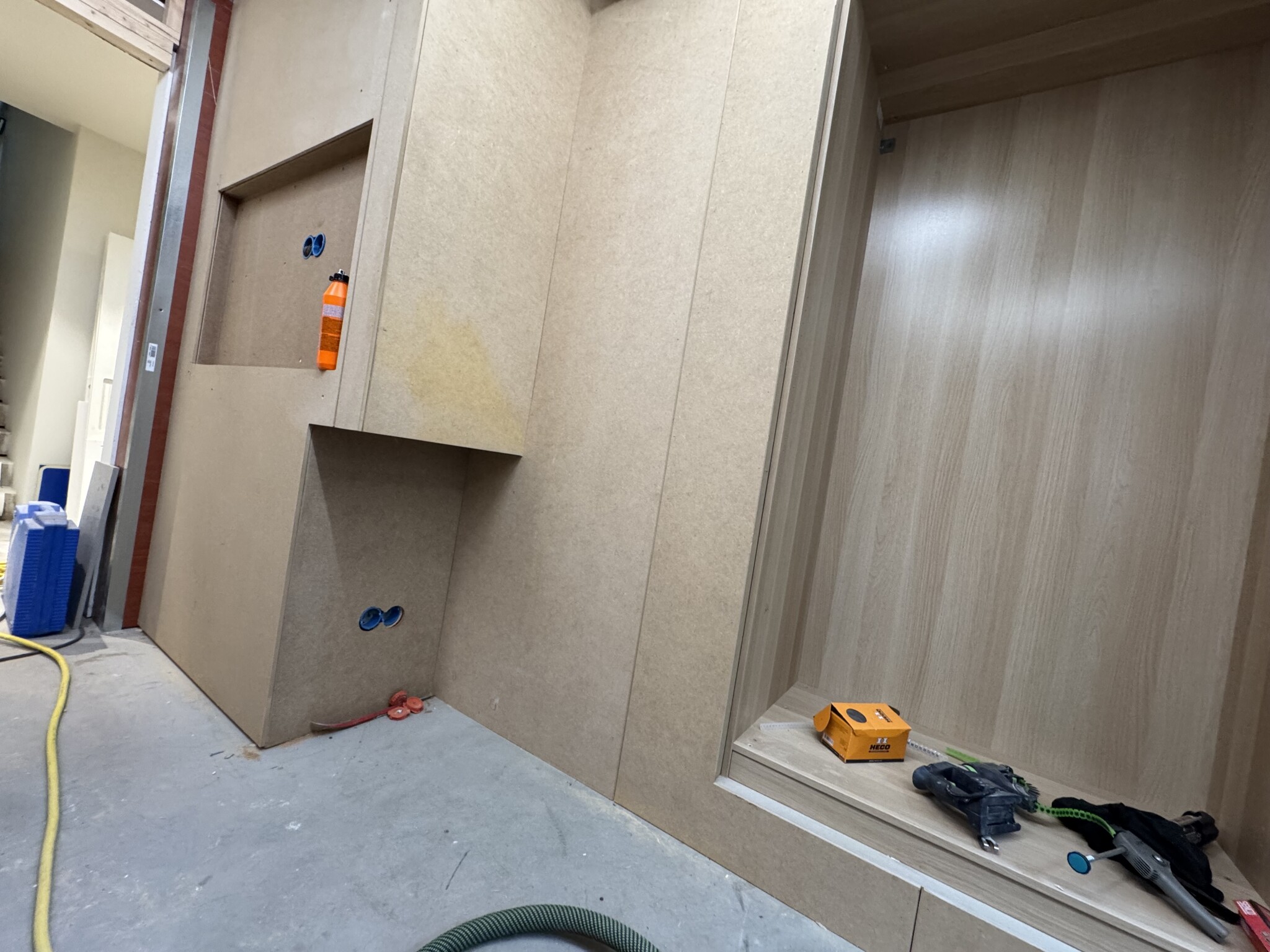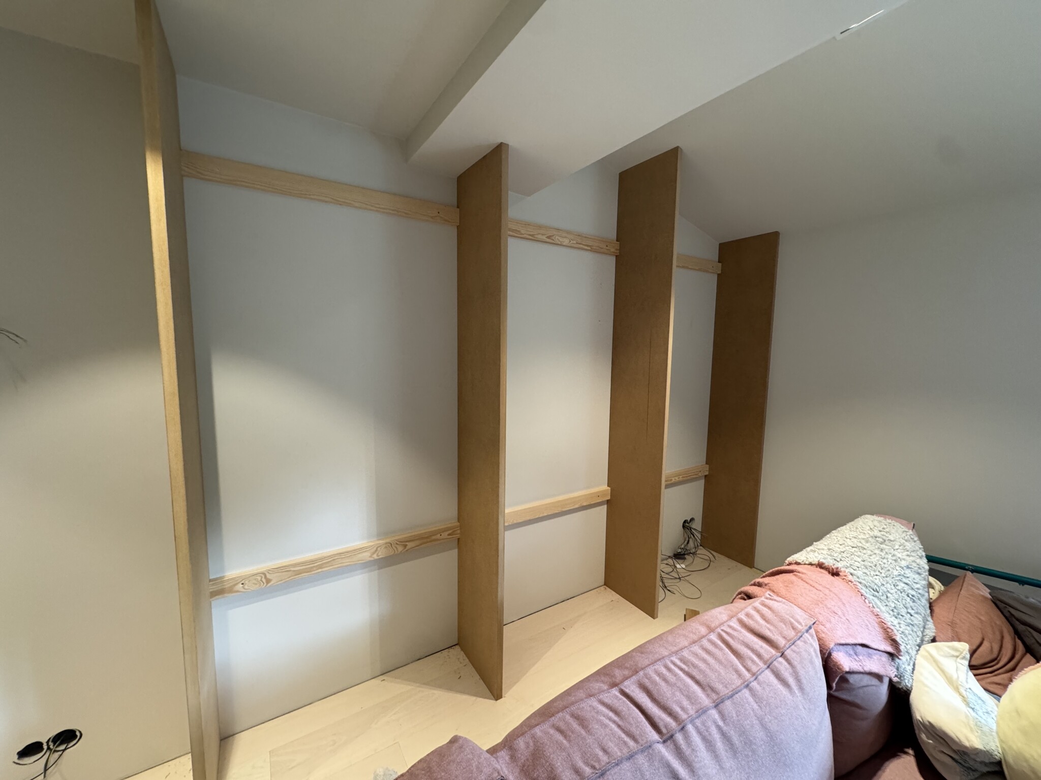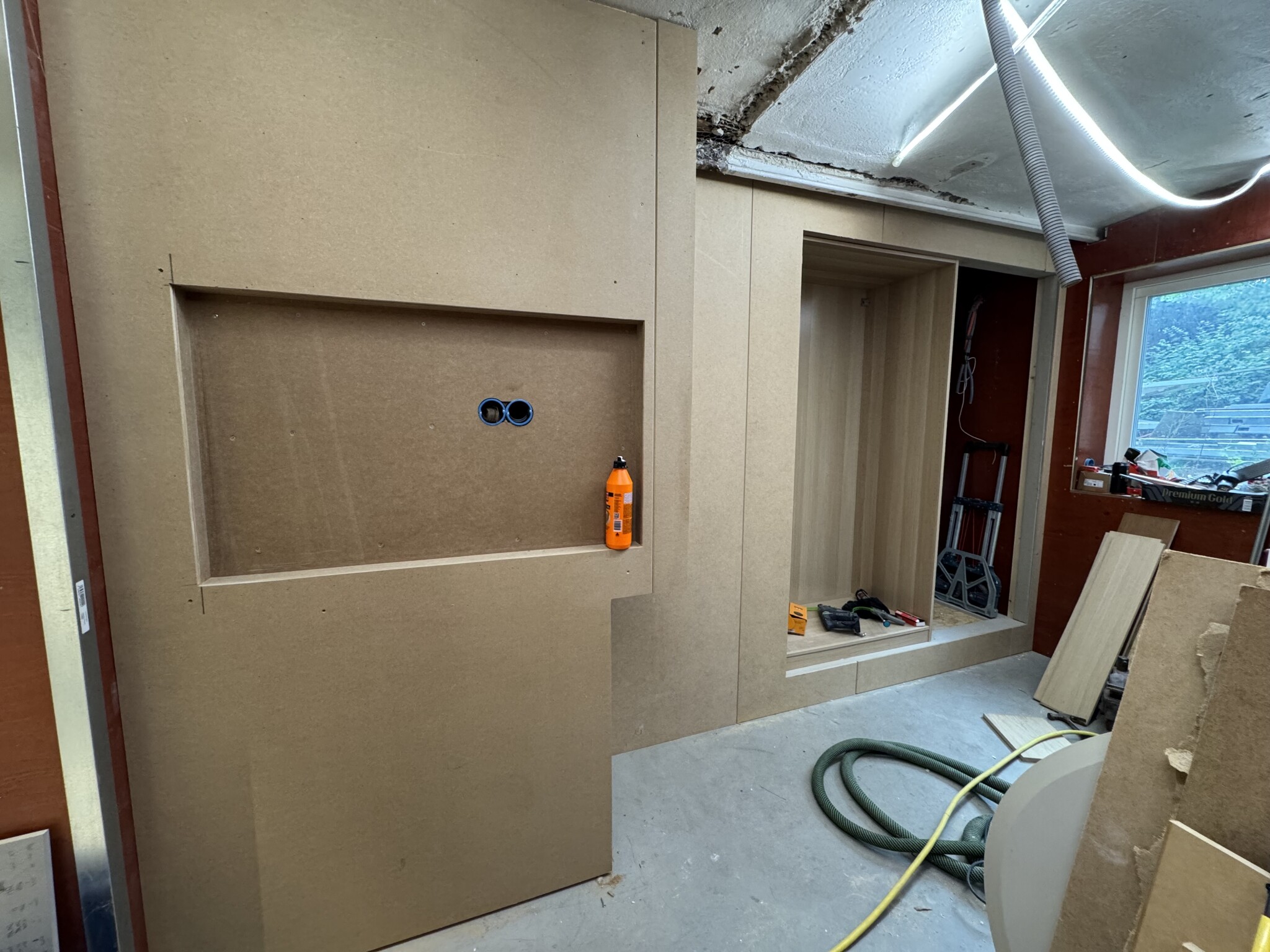 Fick ett ryck och gjorde klart mdf inklädningen som så småningom skall målas med kalkfärg för att bli lite utav en ”möbel” Allt är limmat på plywood och alla innerhörn där två mdf skivor möts har fasade kanter för att undvika sprickbildning, så det blir ett par meter att fylla med plastic padding. Garderobsdörrarna blir ”infällda” 19mm mdf och i samma färg som resten av väggen.