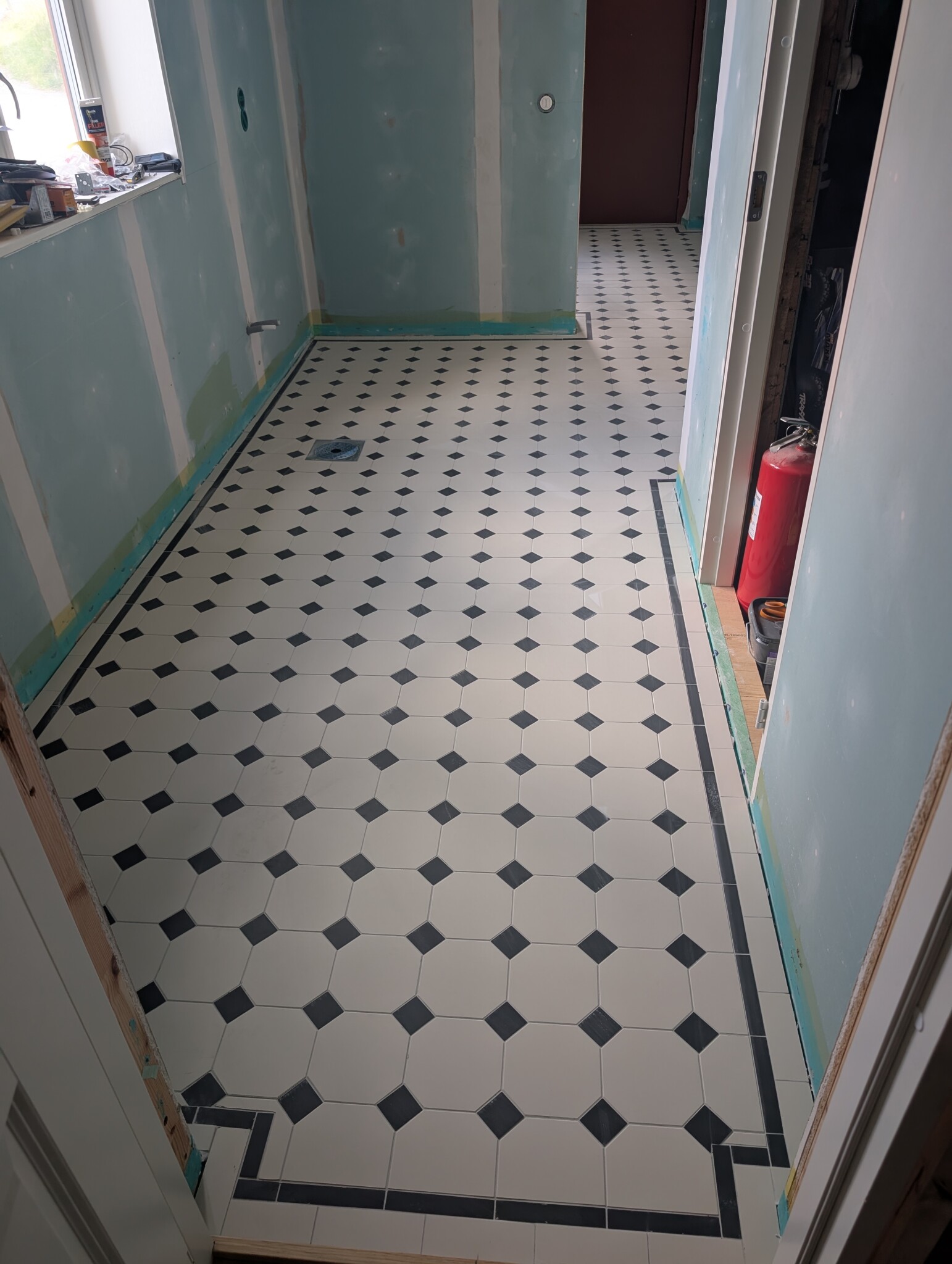 Målning av dörr nästa steg men måleriet har semester några veckor till.