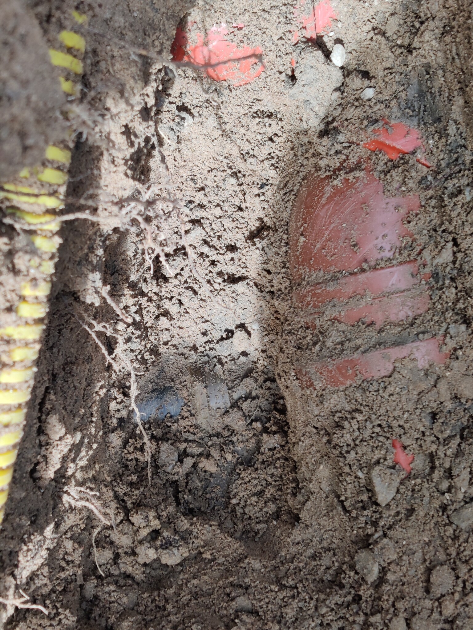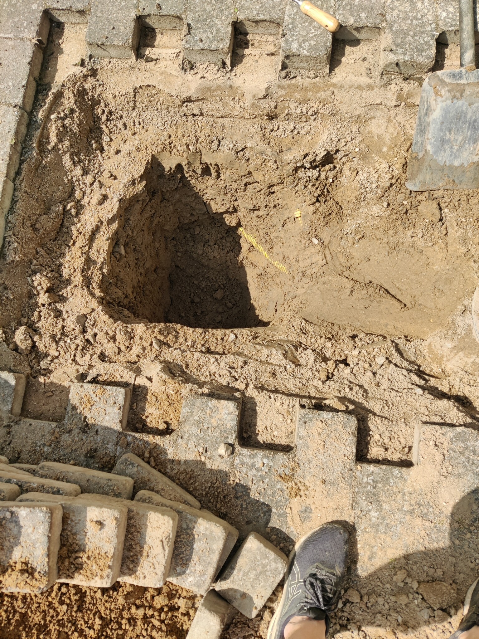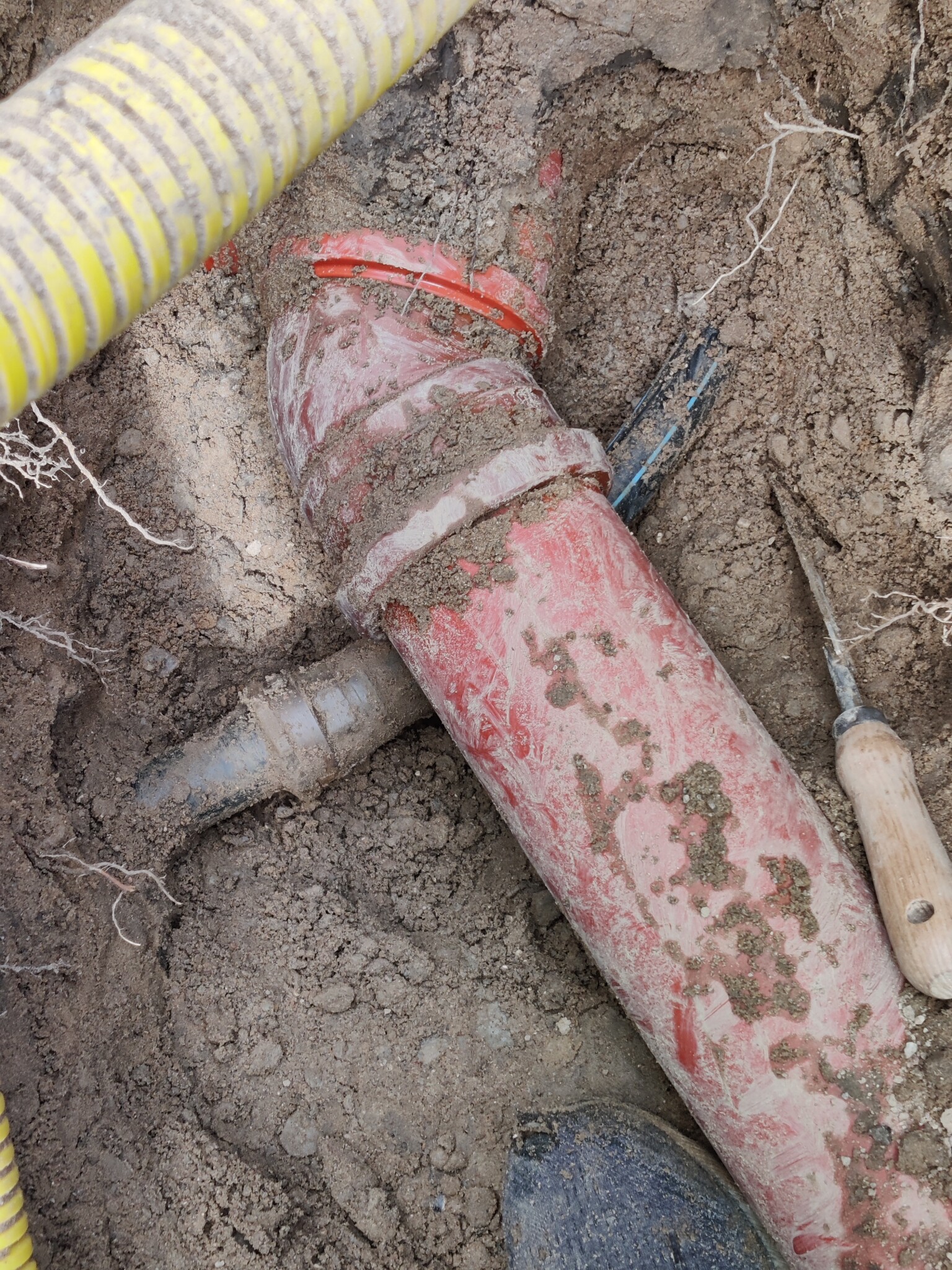 Direkt under avloppsröret från garaget som jag anslöt till stammen 2020 när garget byggdes. Skarven låg bara någon centimeter under, galet att jag lyckades missa den då! Trodde att den låg på åtminsone 1 till 1.5 meters djup, men nej, 90cm räcker tydligen.