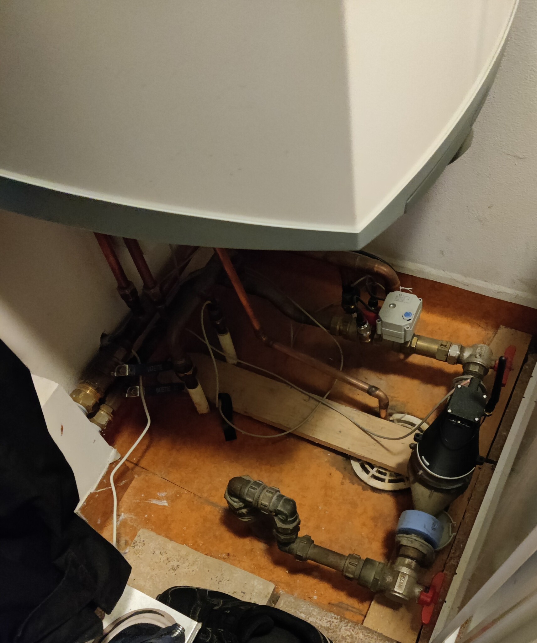 Inte optimalt ur flera perspektiv, inte minst att mätaren sitter monterad i två lösa plank sedan förra beredaren som den tidigare var monterad i gick sönder... Istället är planen att flytta den till andra sidan grovköket i ett vattenmätarskåp...