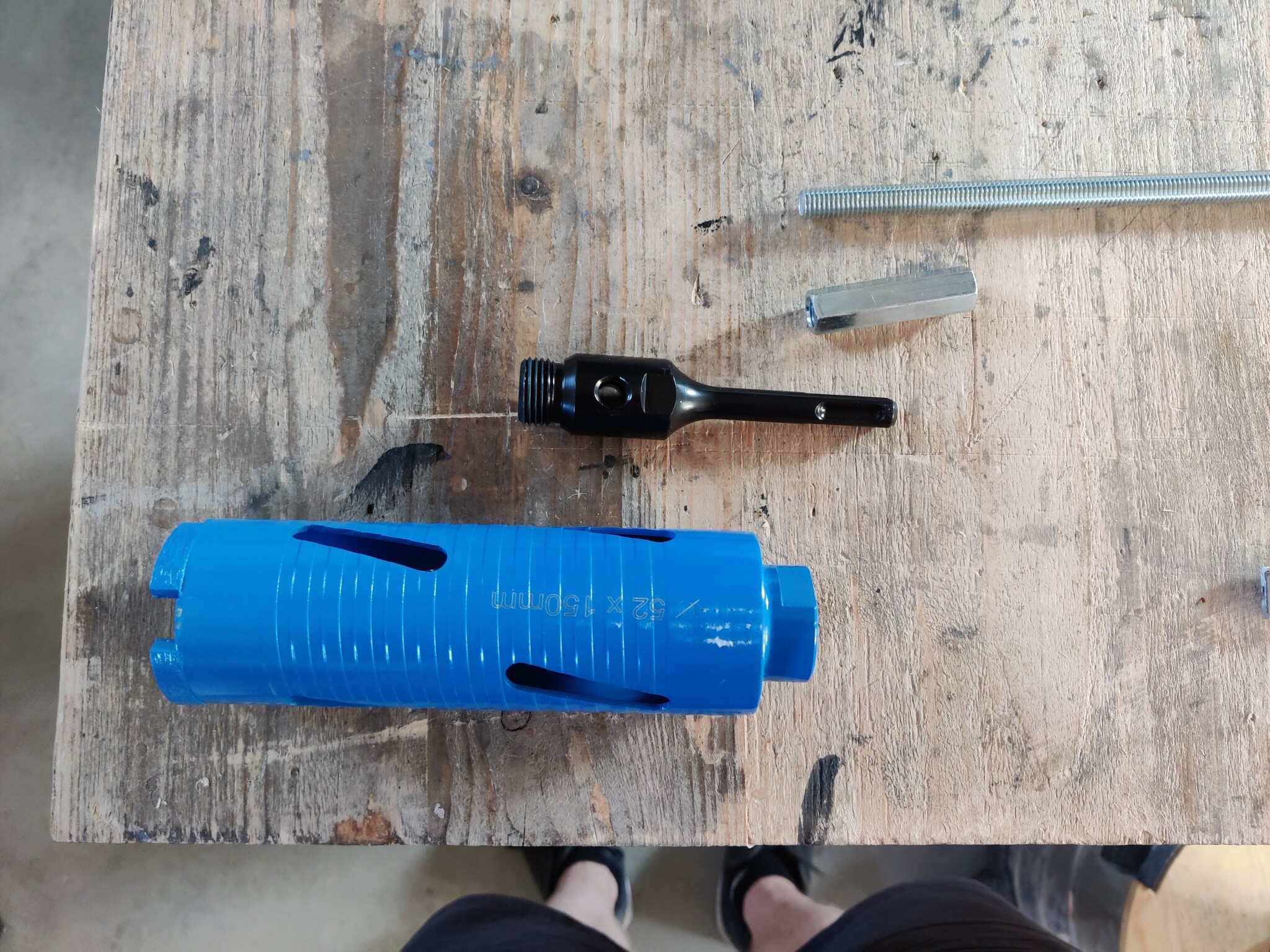 Tänker dra PEM slangen i ett 50mm skyddsrör, så skaffade en hålsåg på 52mm. Dessvärre var det någon udda gänga på hålsågen, och det fanns inte tillräckligt långa förlängare. Så det fick bli en kort SDS+ adapter, M10 skarvmutter och 1 meter M10 gängstång: