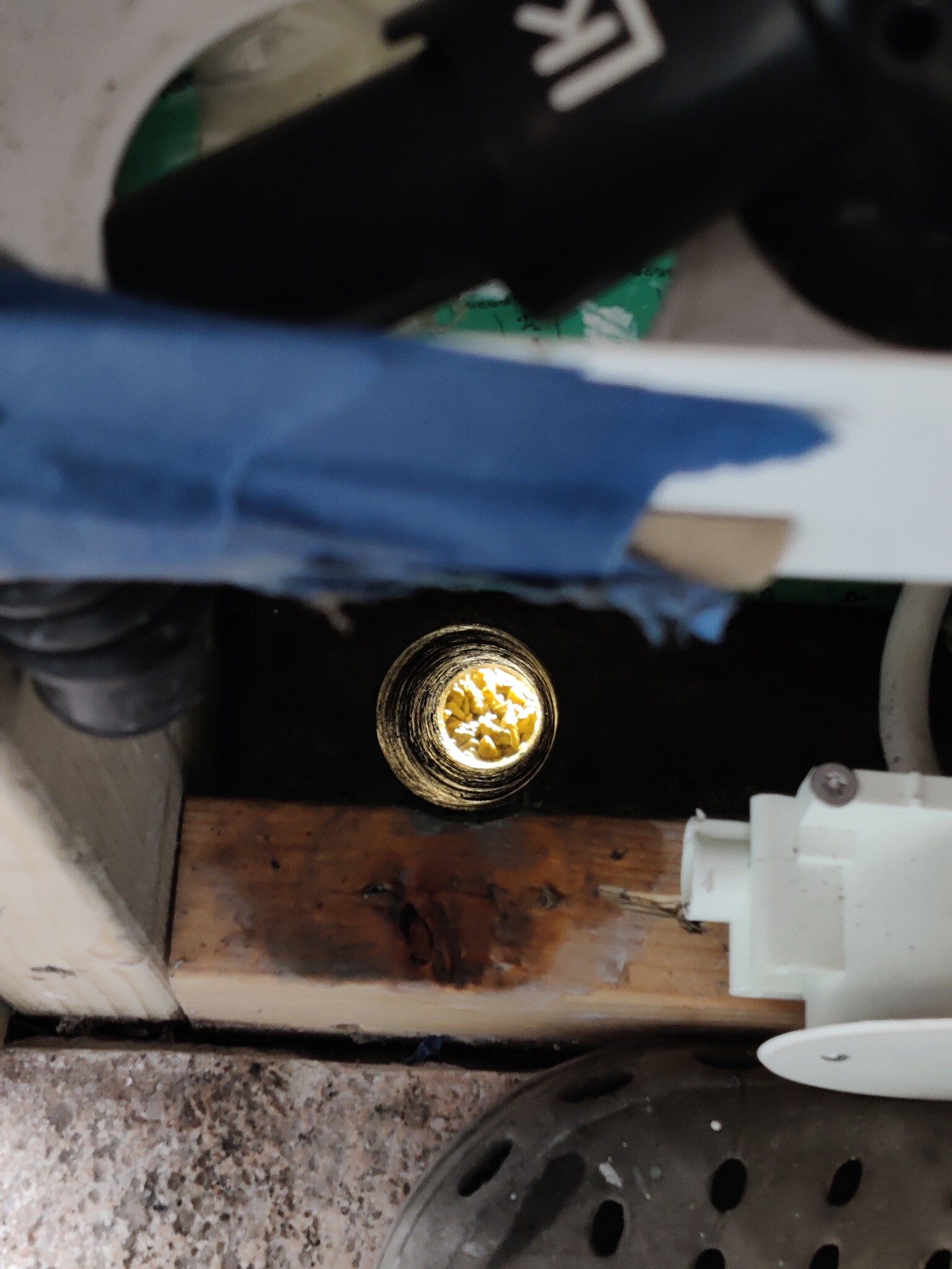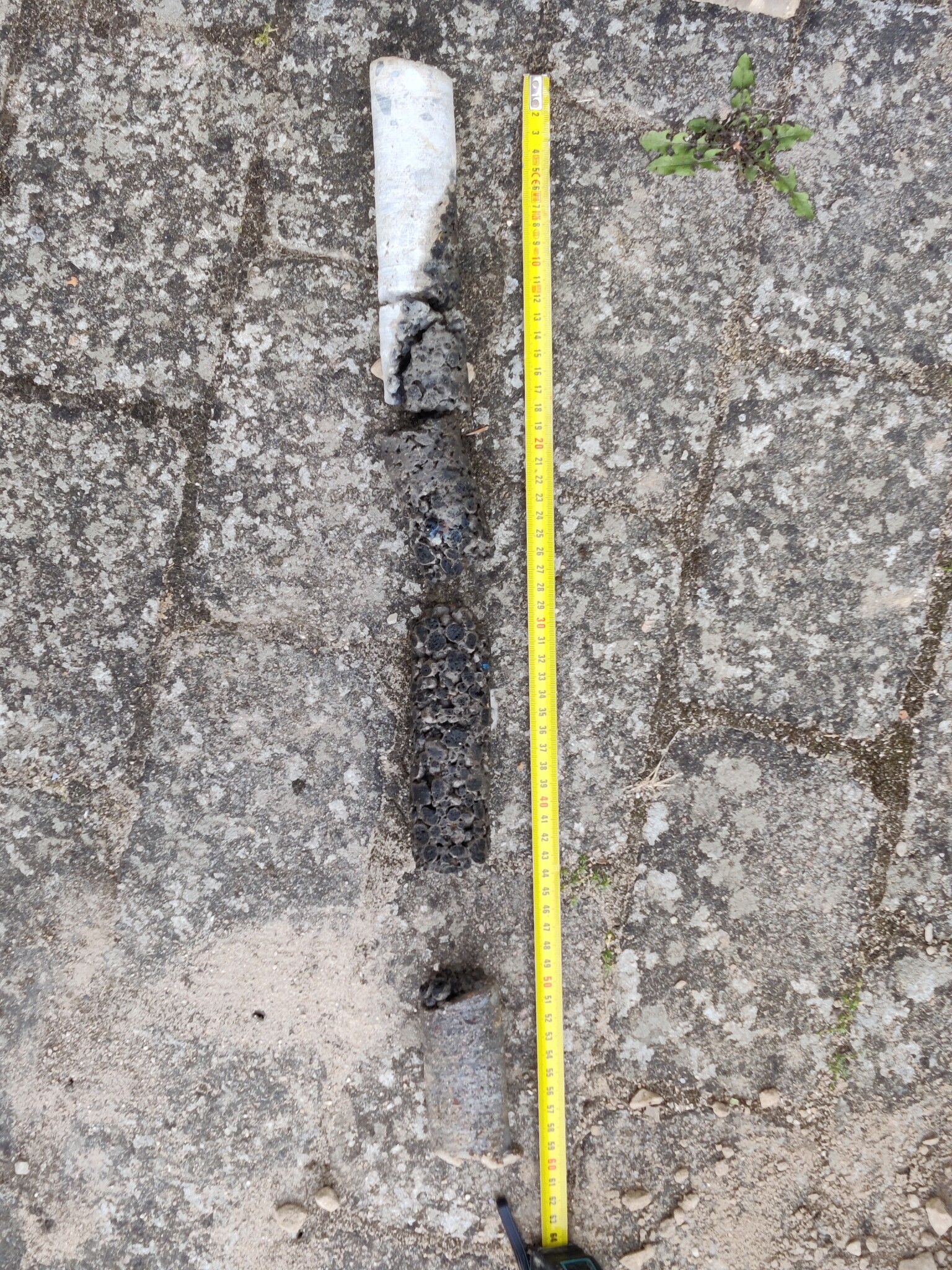 Någon timme senare var hålet klart, ca 57cm långt. Mestadels lättbetong/klinkers, men en hel del betong. Var livsrädd för att borret skulle fastna, i hålet, men icke, det tuffade på bra.