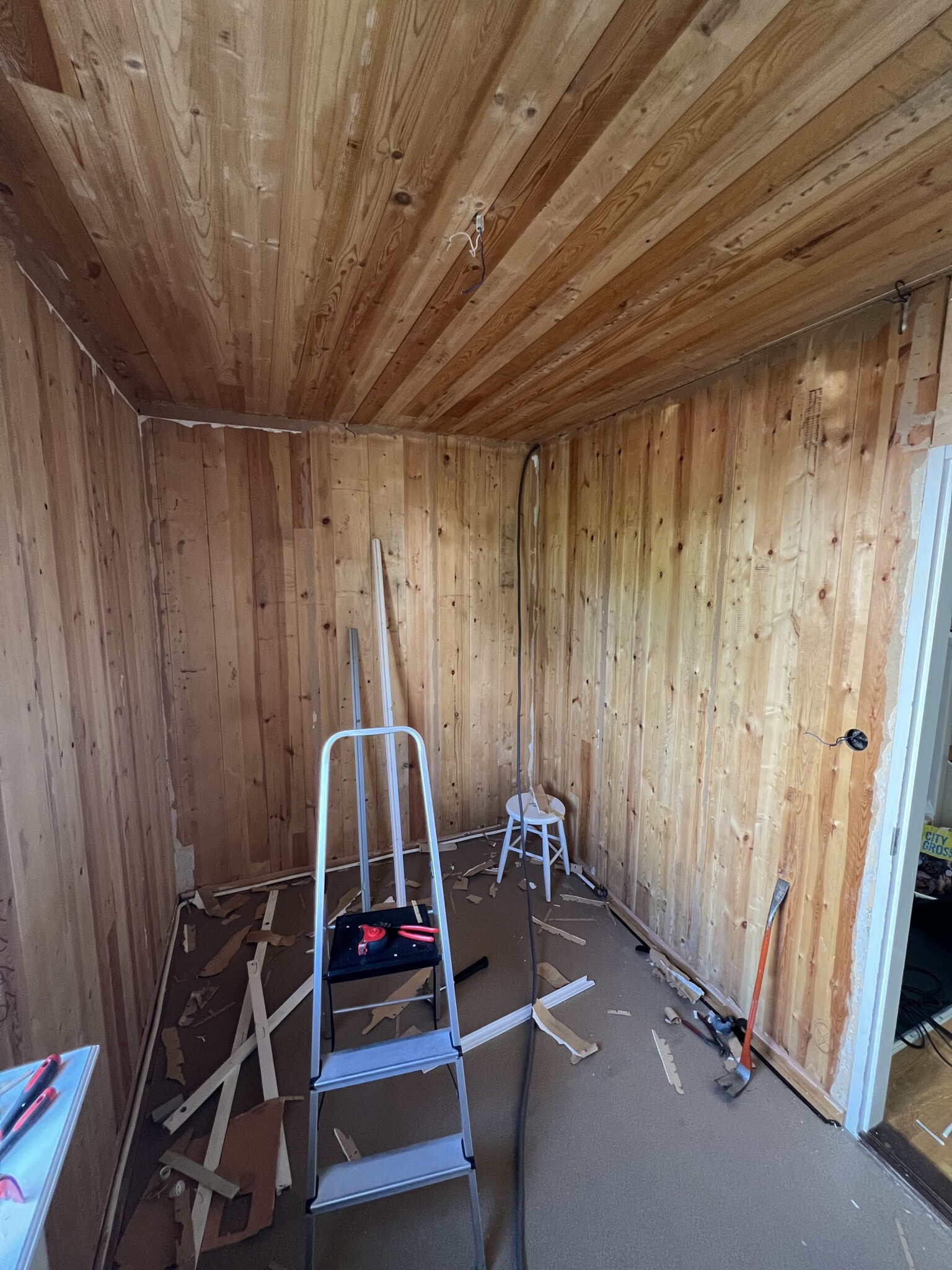 Några nya uttag blir det också, lägger in flexrör mellan byggelementen i innerväggen som tack och lov inte är spånfyllda till skillnad från ytterväggarna.